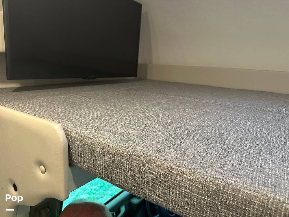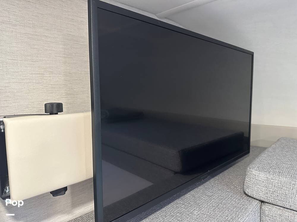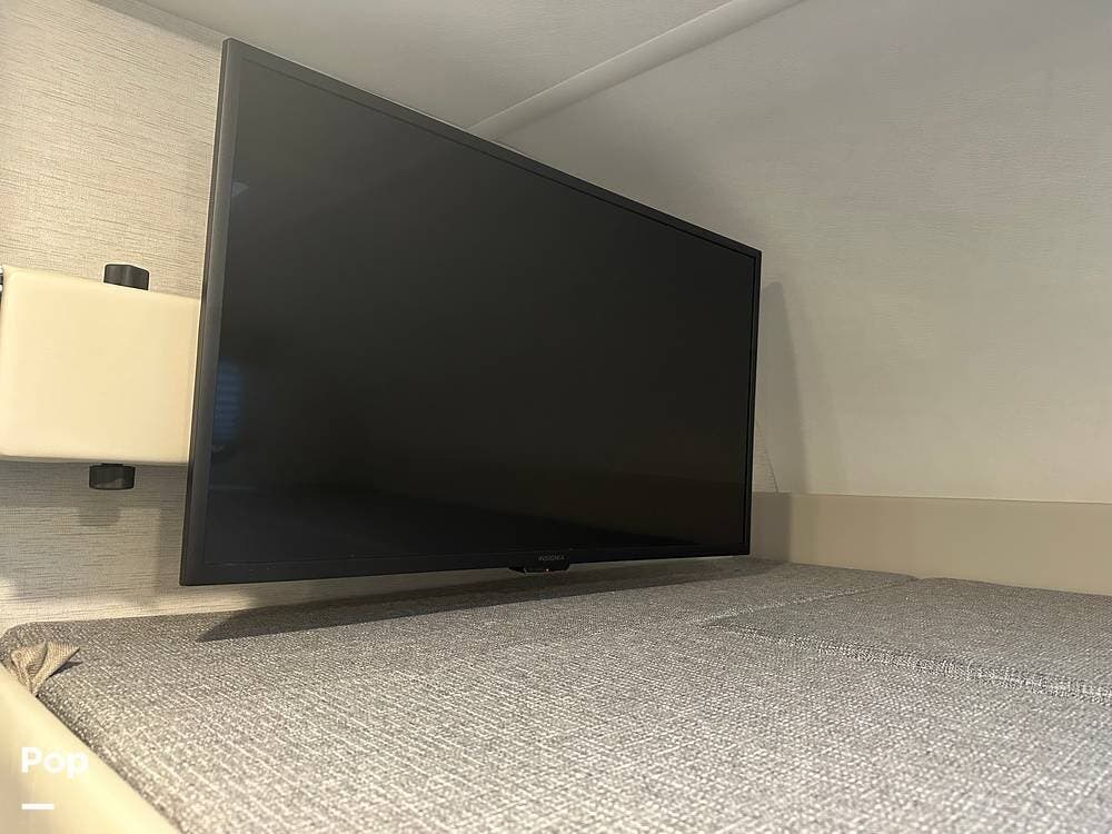 Booth dinette with a charging station, a sofa that goes to a jackknife bed, a bed above the cab with a TV on a manual swivel arm.