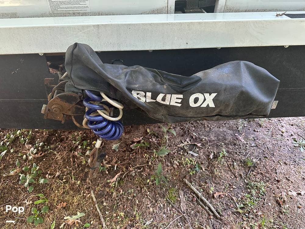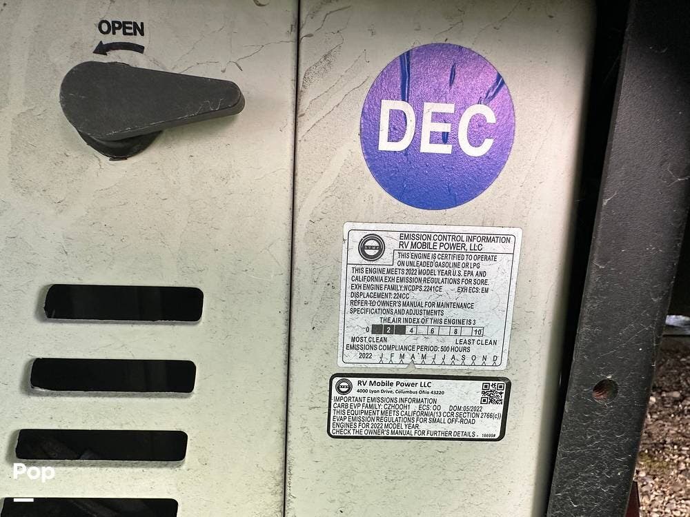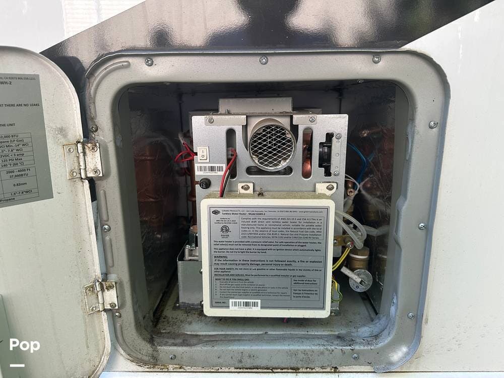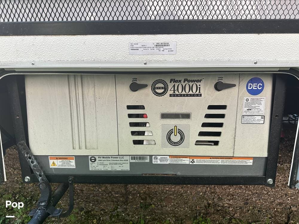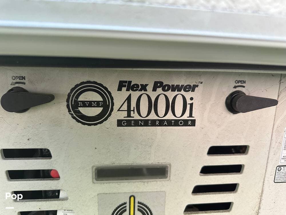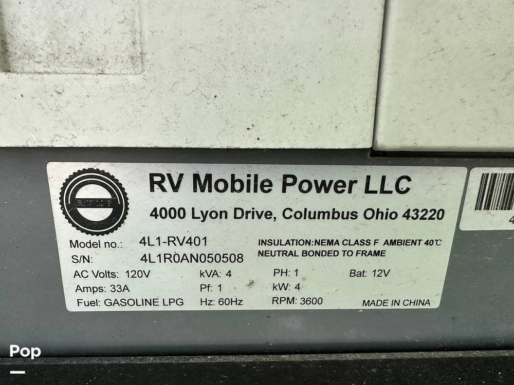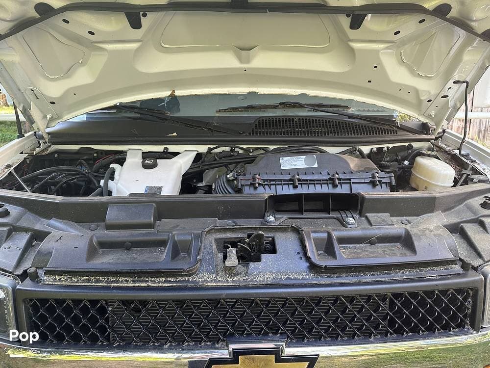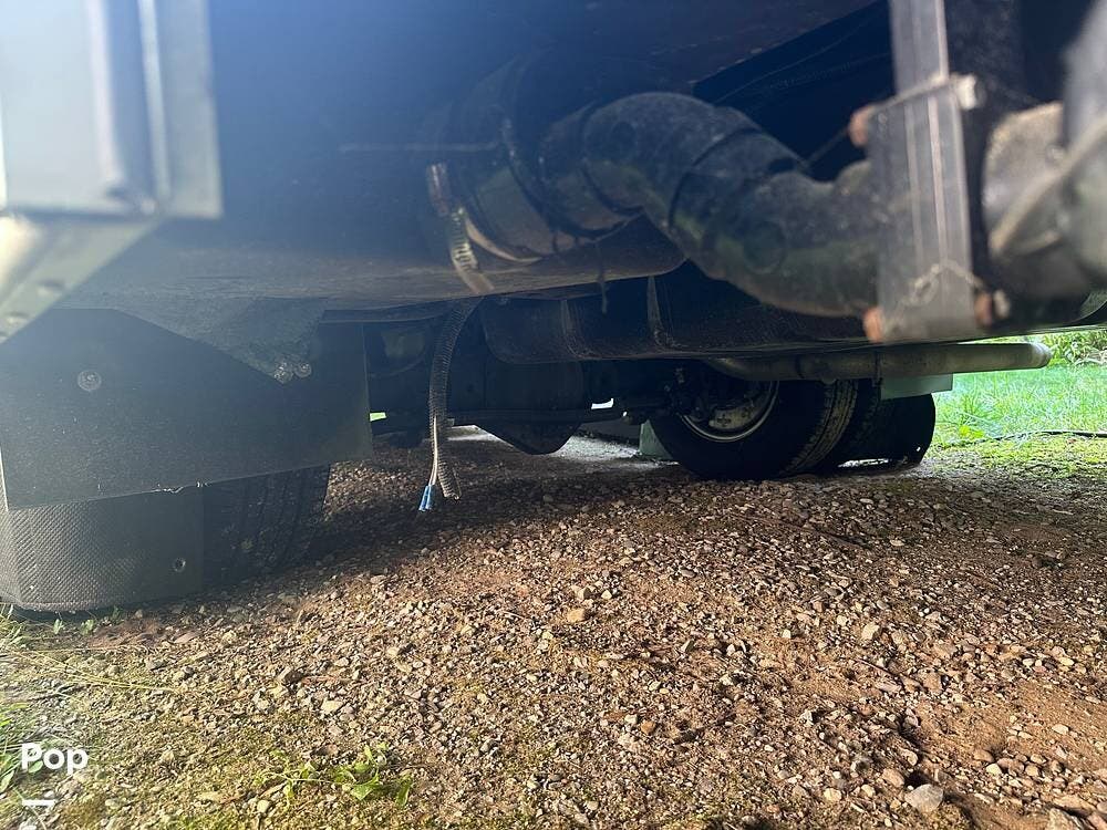 Chevy 6.6L V8 engine, generator, water, and propane quick-connect spouts, large pass-through storage in back, tankless water heater, and Blue Ox hitch. Large awning for shade.
