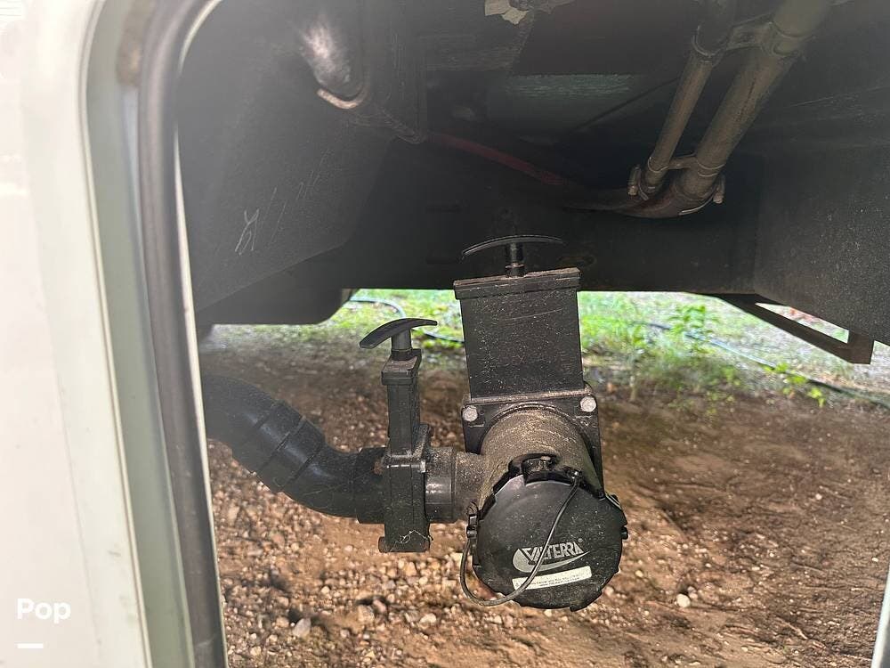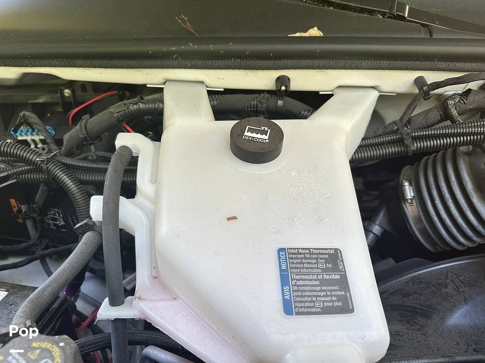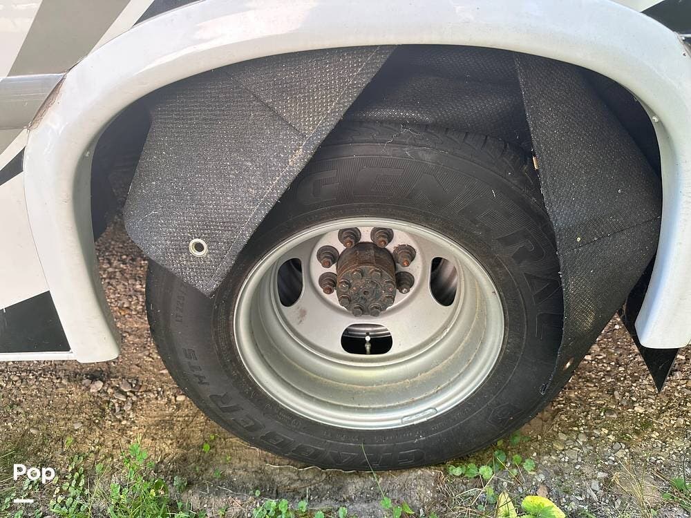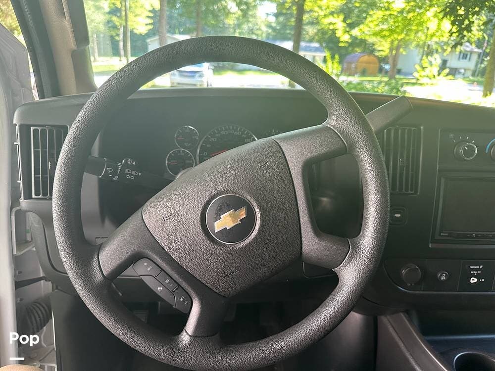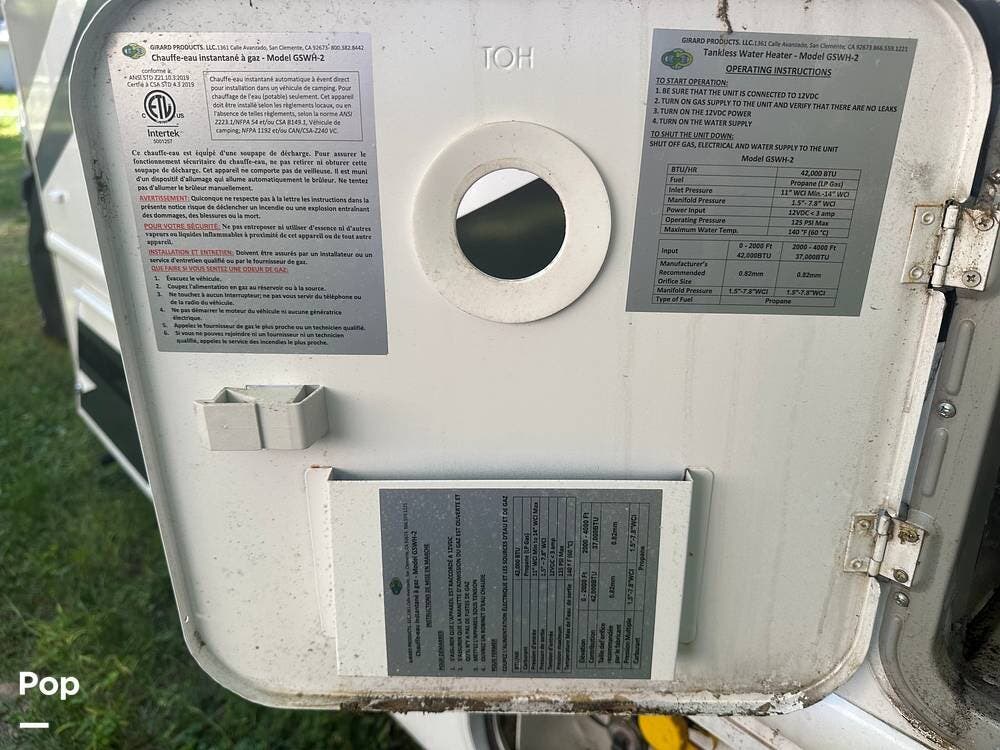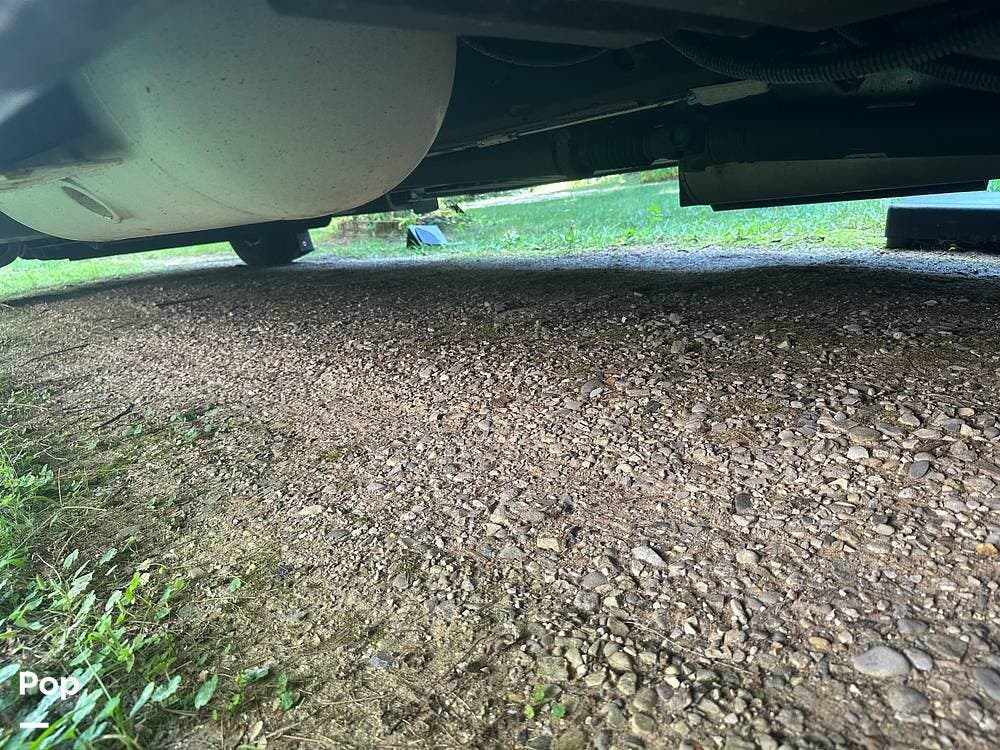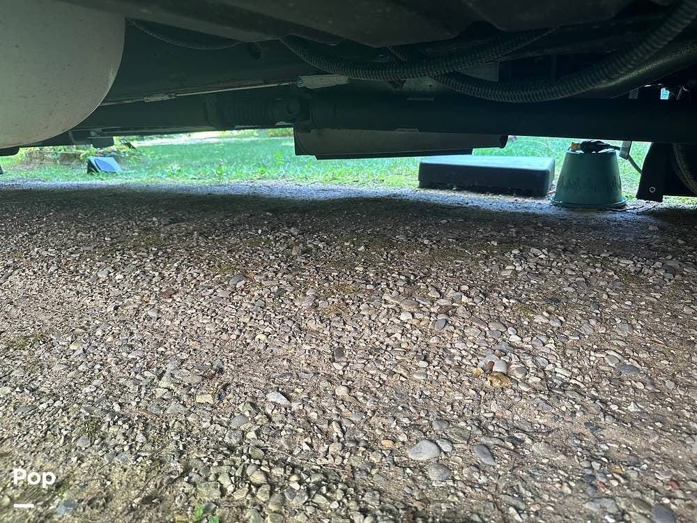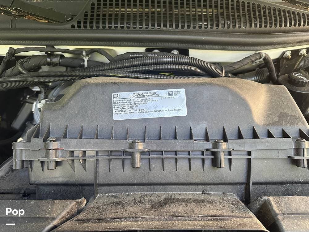 Chevy 6.6L V8 engine, generator, water, and propane quick-connect spouts, large pass-through storage in back, tankless water heater, and Blue Ox hitch. Large awning for shade.