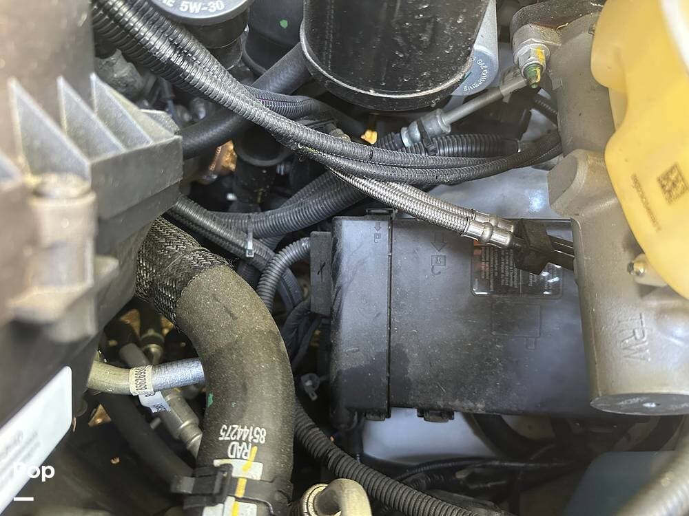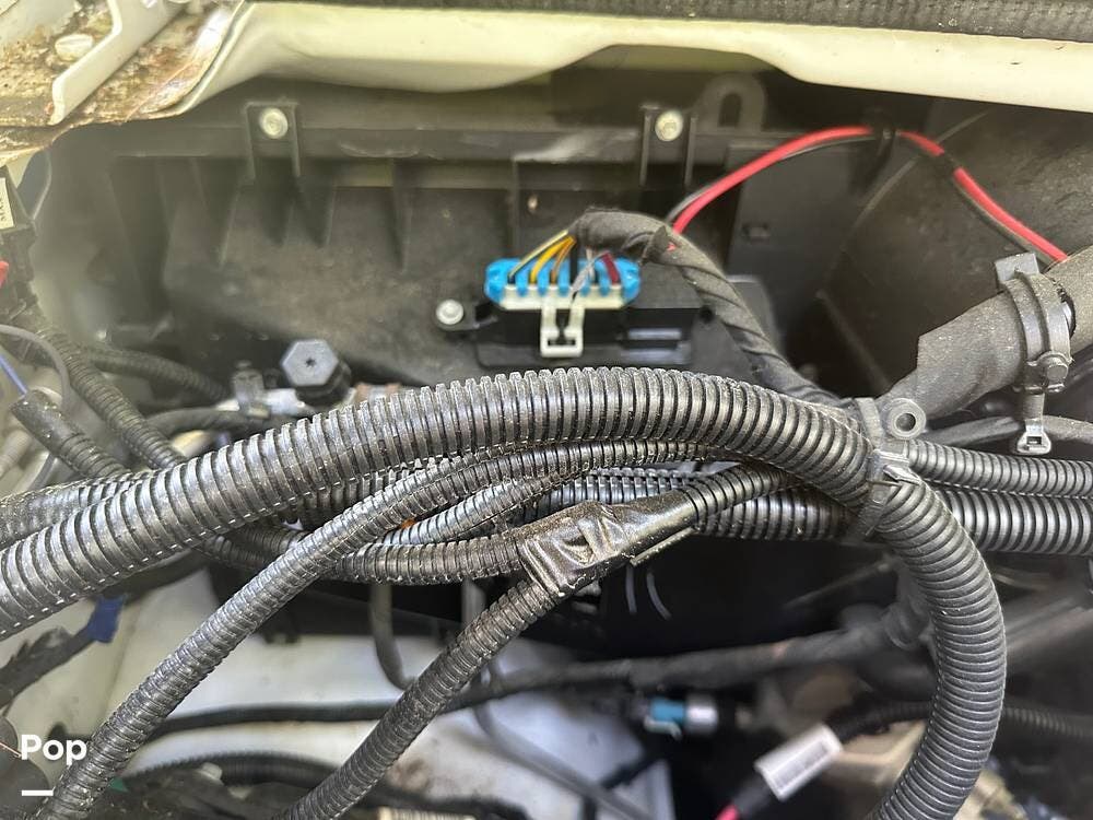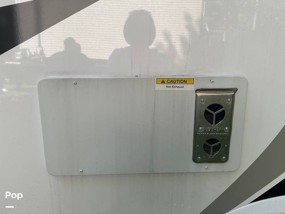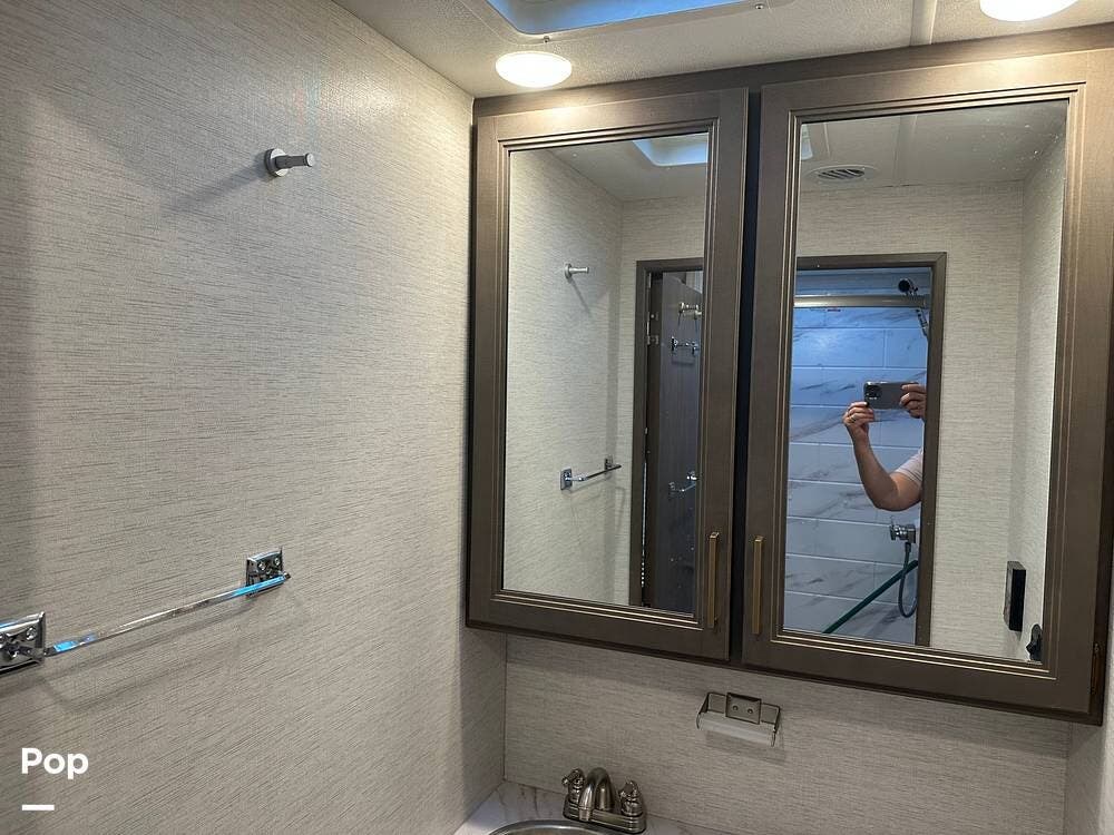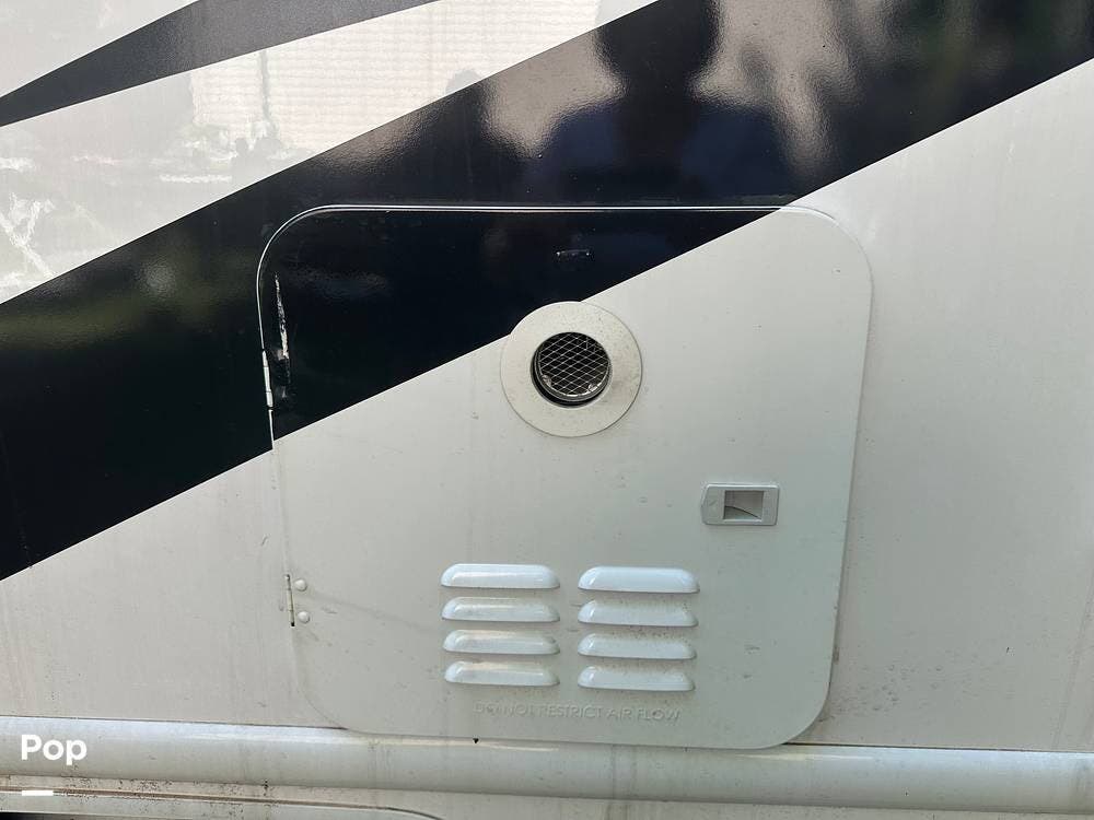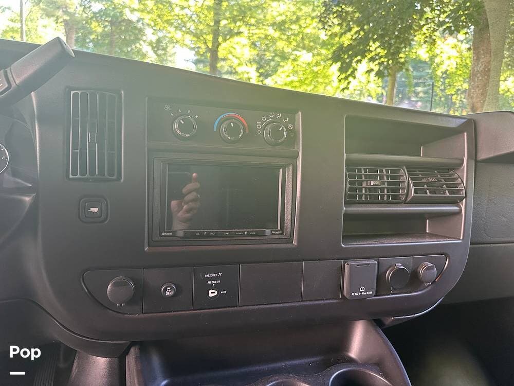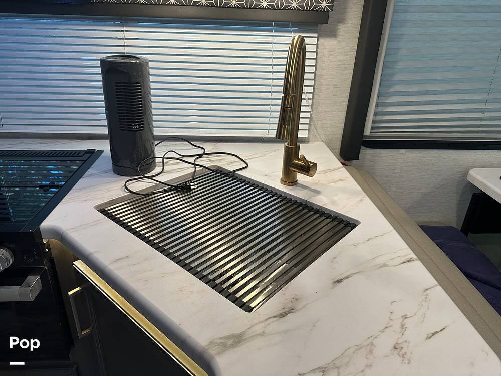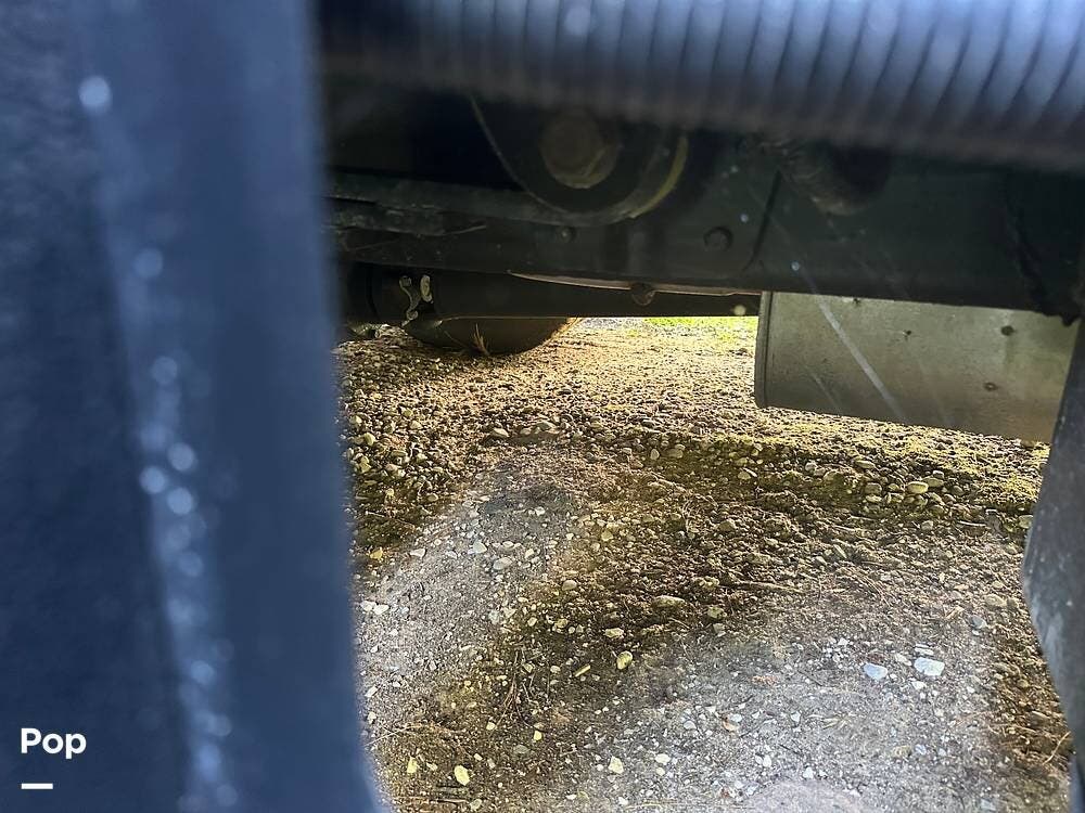 Chevy 6.6L V8 engine, generator, water, and propane quick-connect spouts, large pass-through storage in back, tankless water heater, and Blue Ox hitch. Large awning for shade.