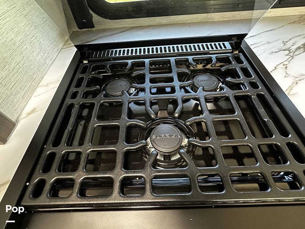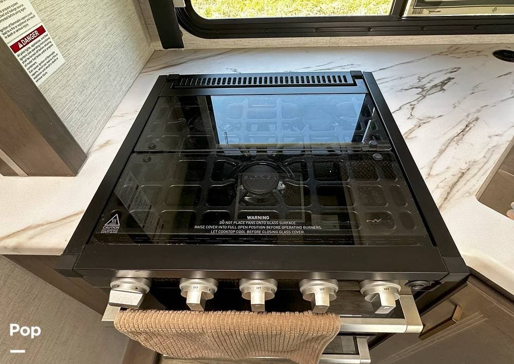 The fully equipped kitchen features a 3-burner gas cooktop, a microwave, a double-door refrigerator, and generous countertop space for easy meal prep.