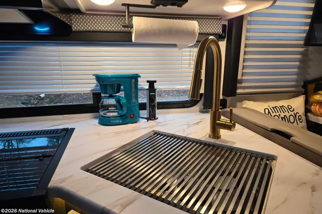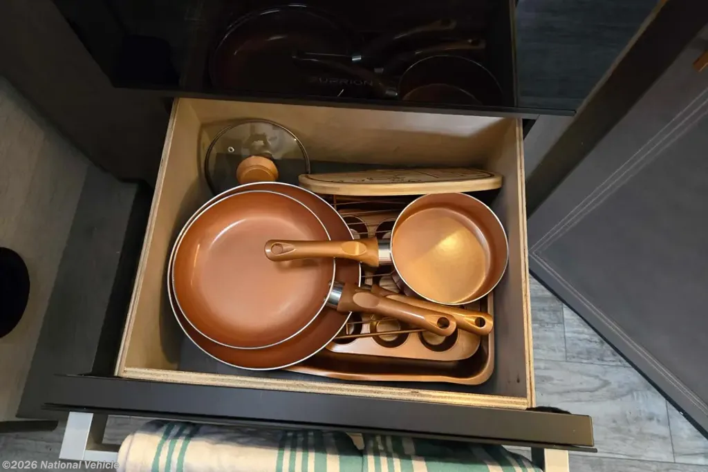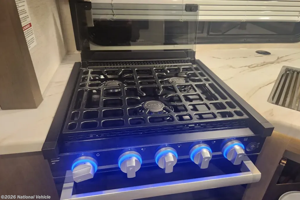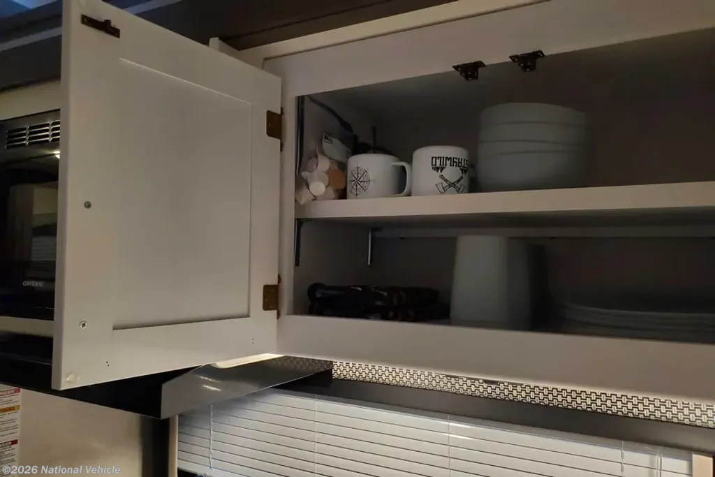 Step inside and take a look back at all of the convenient features that would make any journey enjoyable. The kitchen area features everything you need to prepare great meals on the go including a sink, a three burner range with microwave/convection oven, and a refrigerator/freezer. There is also plenty of storage for all of your dry and canned goods. Have a seat at the comfortable dinette (can convert into a double/full size bed for extra sleeping space), where you can enjoy meals with your family.