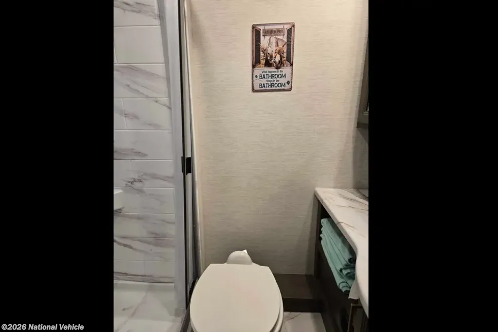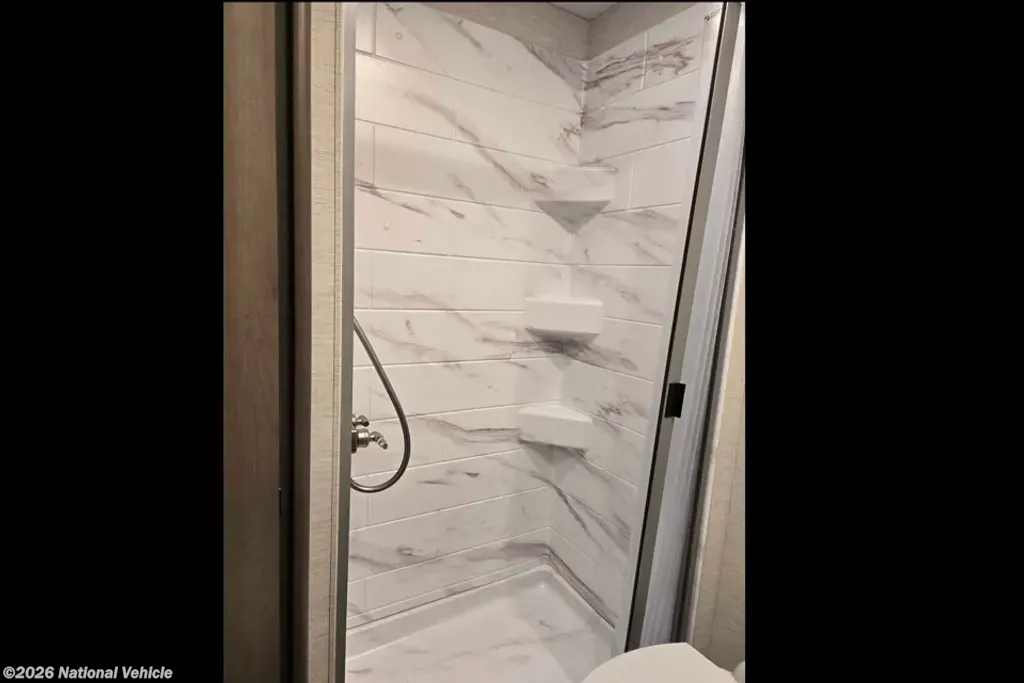 This coach features a bathroom complete with shower, toilet, and a sink with a medicine cabinet above for your convenience.