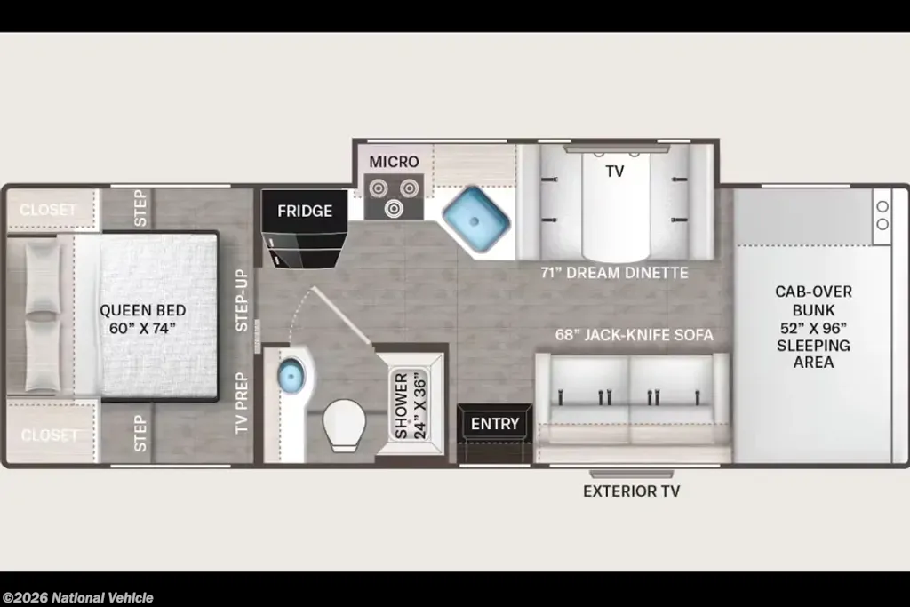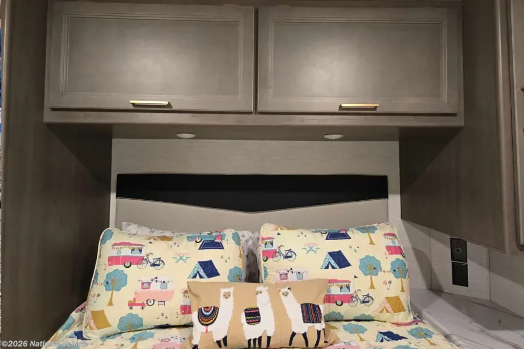 The master bedroom offers a spacious retreat thanks to the queen bed with mattress topper that has a closing panel for privacy. You will find clothing storage, a TV, plus a bit of overhead storage too.