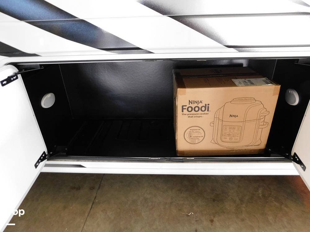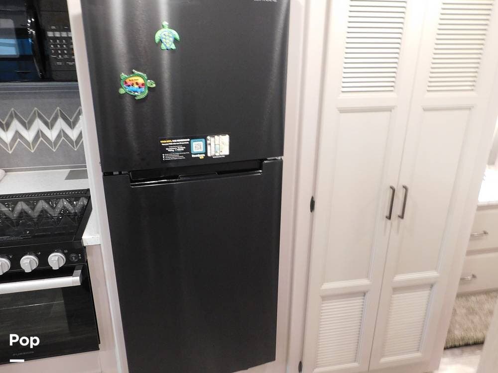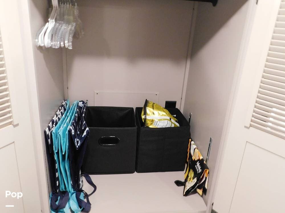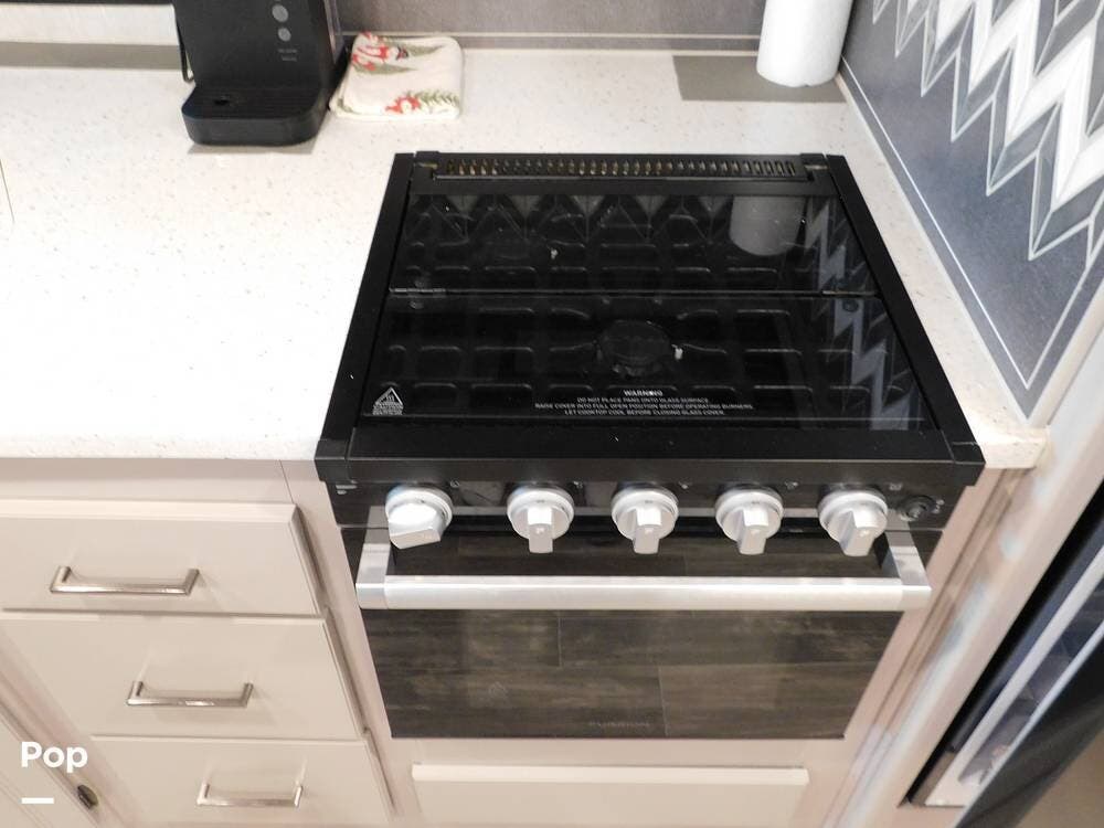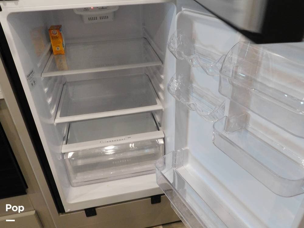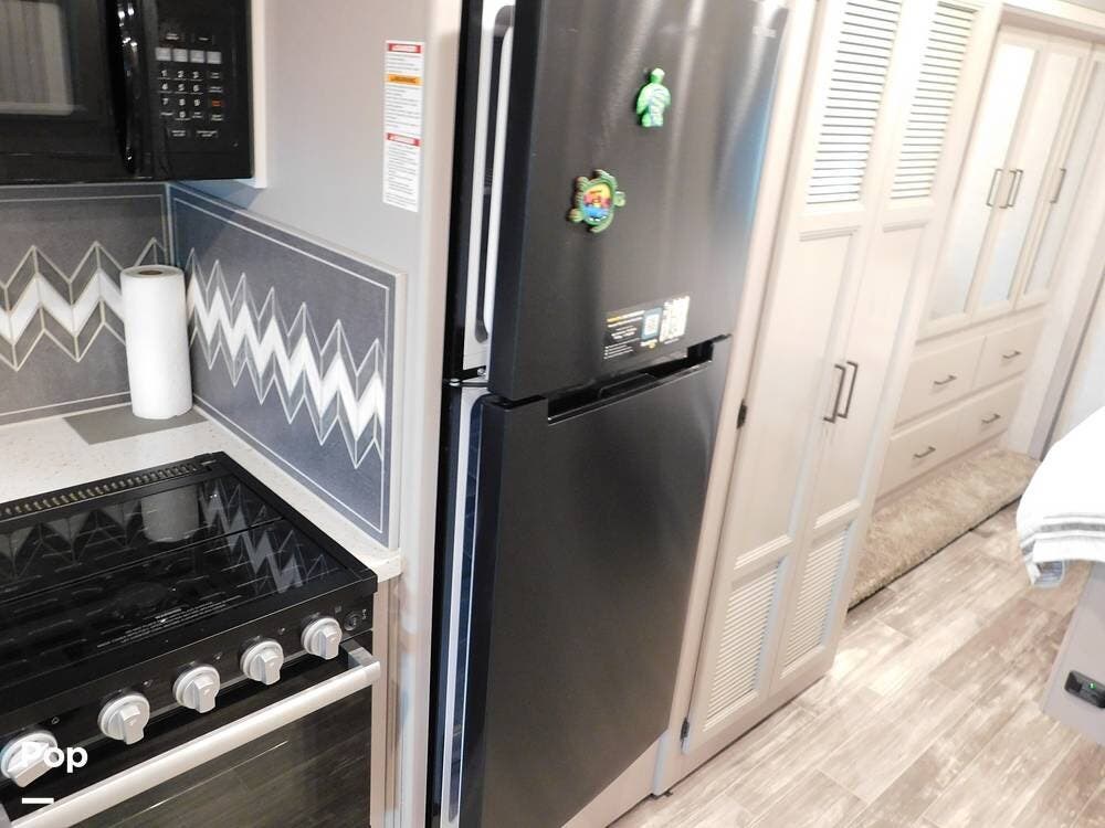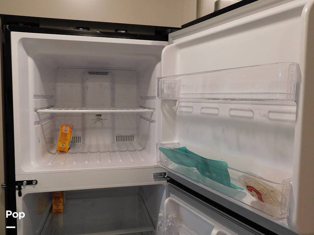 The kitchen features a residential refrigerator, 3-burner gas cooktop/oven with a bi-fold glass cover, 30" over-range microwave, large double bowl stainless steel sink, and kitchen countertop LED accent lighting. Just behind the kitchen is a closet ready for you to install a combo washer/dryer if you choose.
