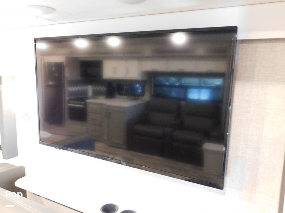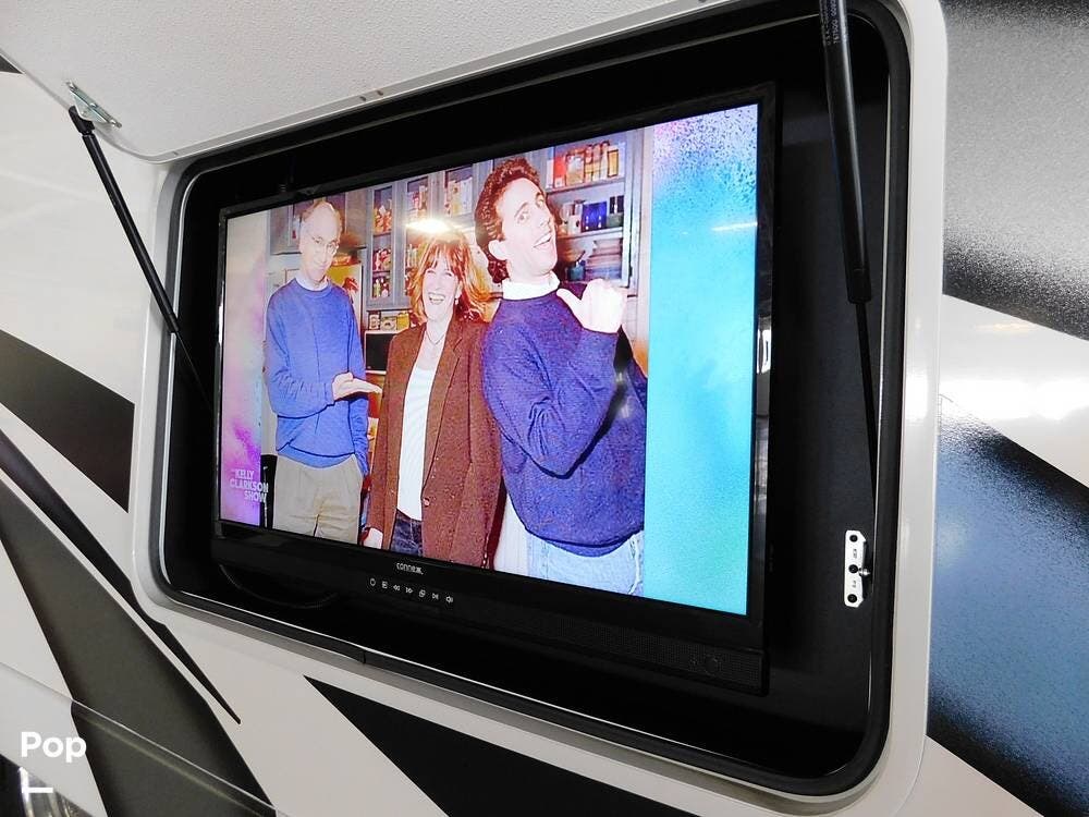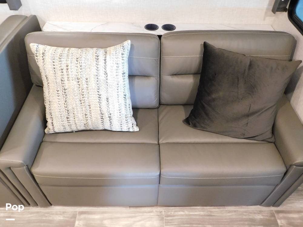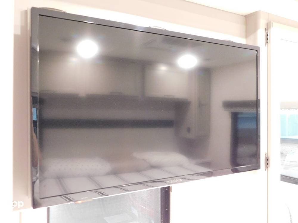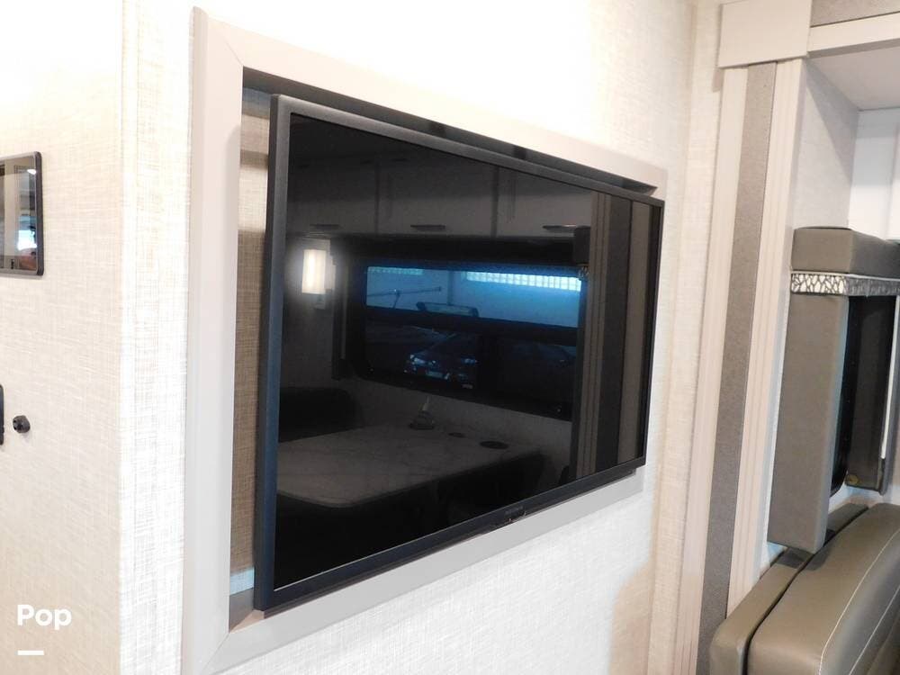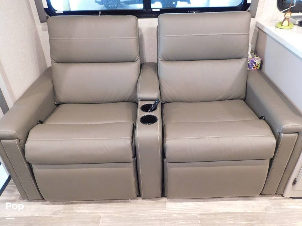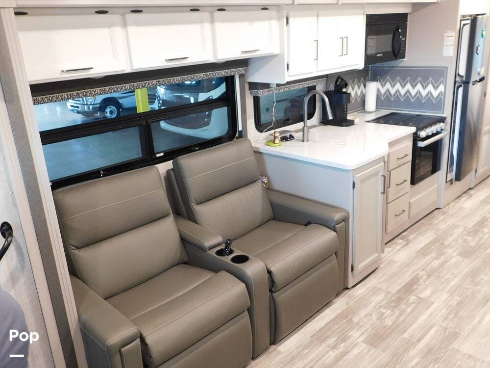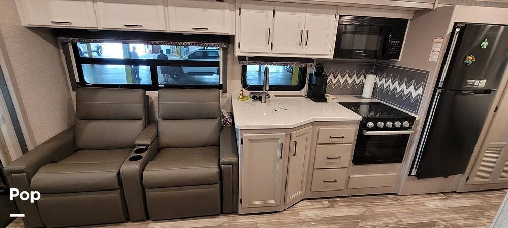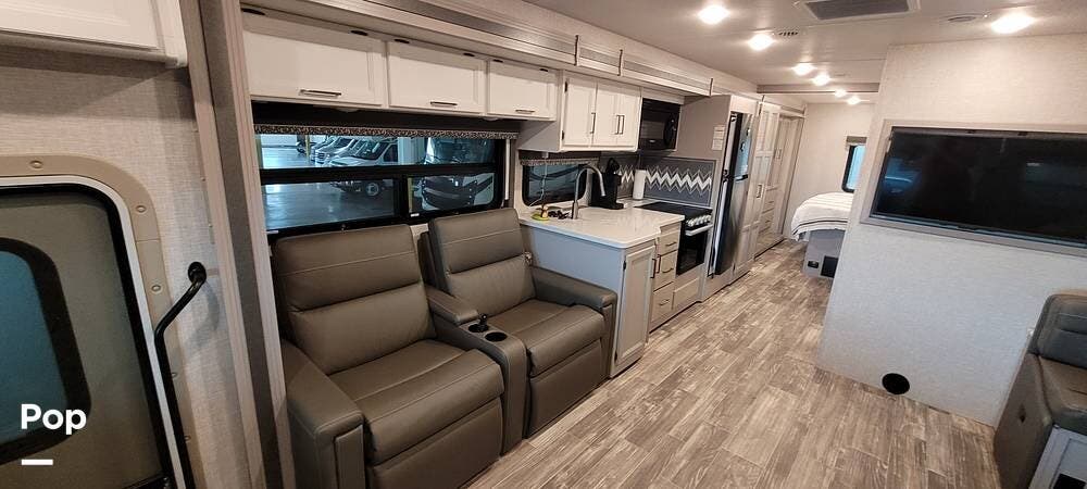 Stepping onboard, you will notice an abundance of space with the opposing slides. On the driver's side, you have a sofa sleeper with an LED TV above and a dream sleeper dinette. Up front is a drop-down overhead power bunk plus reclining/swivel leatherette Captain's chairs with a stow-away coffee table in between. On the curbside is theatre seating with footrests. To the rear of the living room is a second wall-mount LED TV!