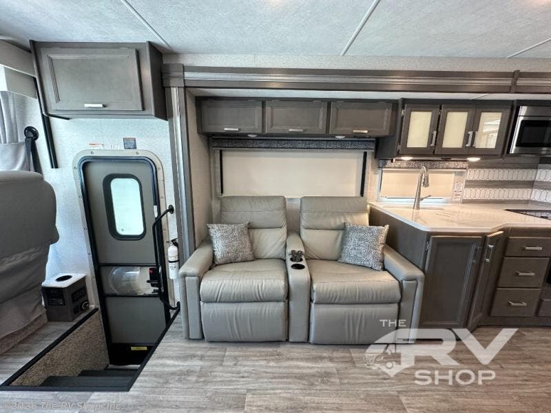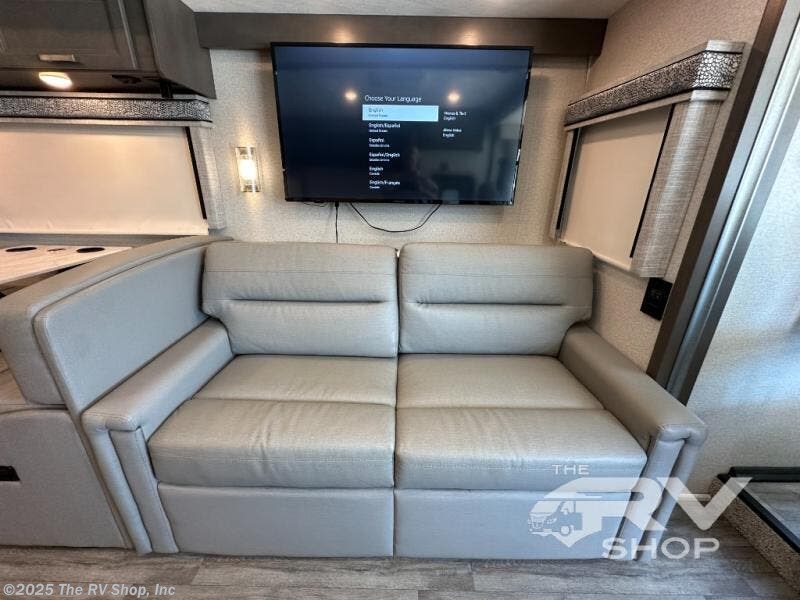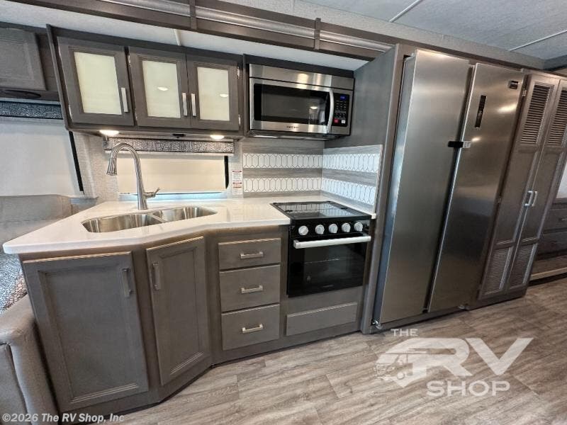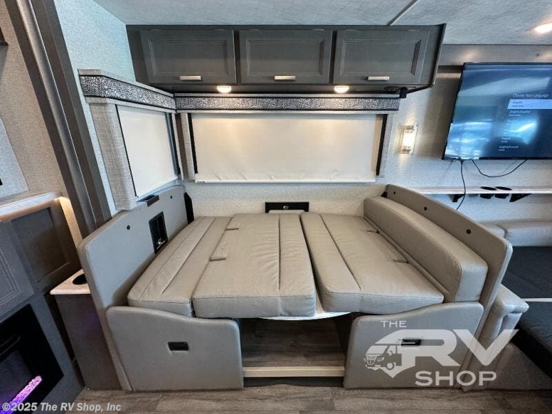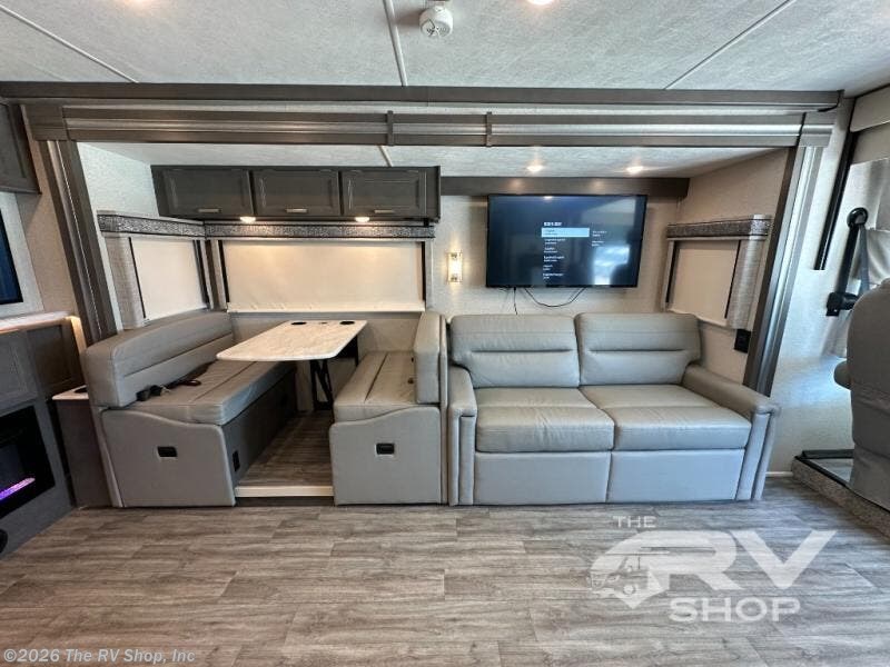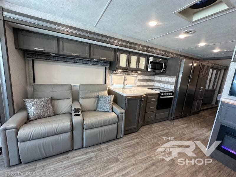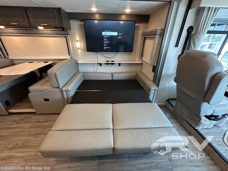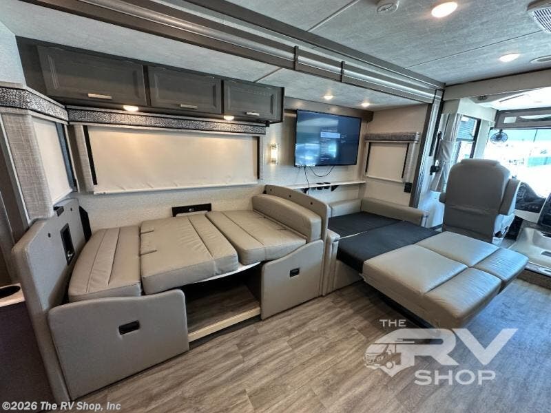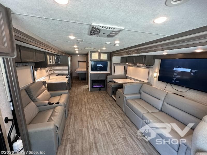 This spacious Class A motorhome has room to sleep eight! Enjoy the privacy of the rear king bedroom which has a spacious closet and a 32" LED Smart TV. Extra guests can utilize the Dream Dinette, the sofa bed, or the drop-down overhead bunk which has a Cotton Cloud mattress for comfort. As if that's not enough, there's a pair of leatherette theater seats with footrests so you can kick back and watch either the 39" or 50" LED Smart TV in the living room. You'll also find another TV outside. A full bath with 30" x 36" shower is conveniently located in the center so everyone has access, and the glass shower door and skylight make it feel roomy. The kitchen features a three-burner gas cooktop and oven, refrigerator, and stainless steel convection microwave. You will also appreciate the closet with stackable washer and dryer prep if you want to add those appliances!