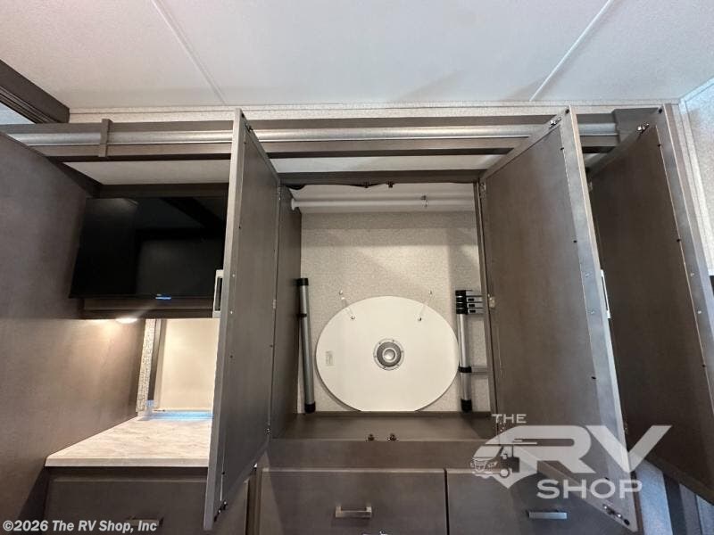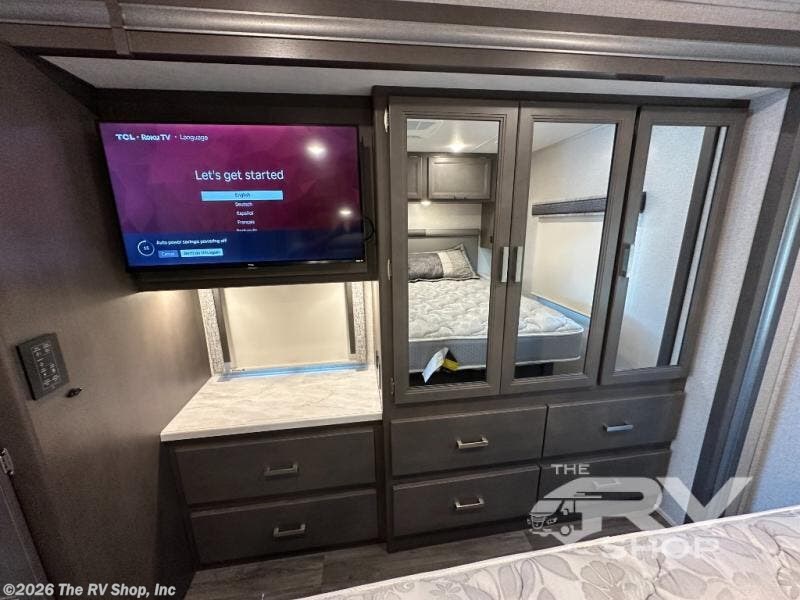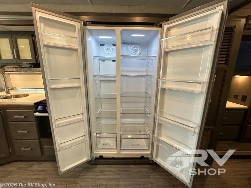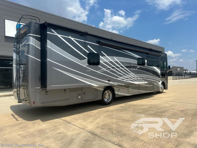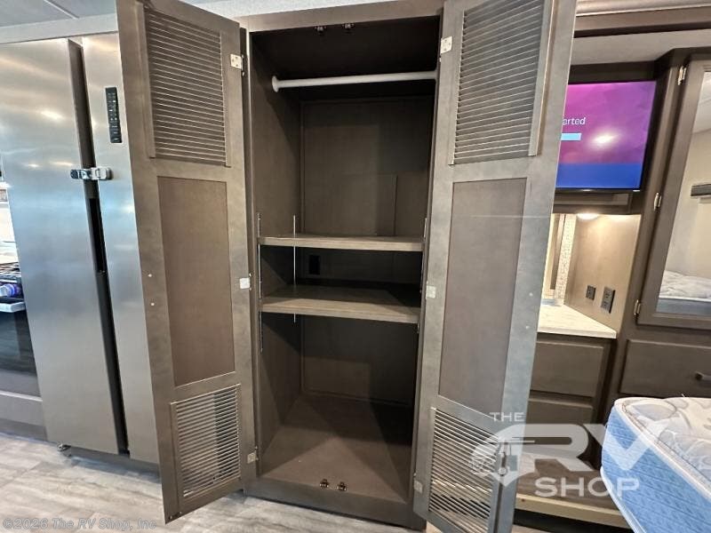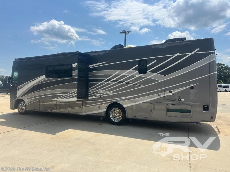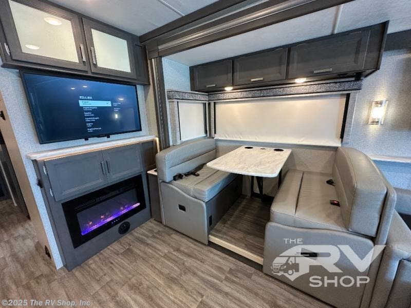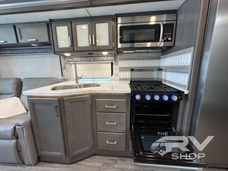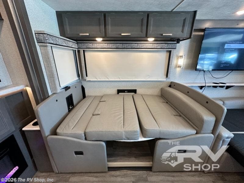 This spacious Class A motorhome has room to sleep eight! Enjoy the privacy of the rear king bedroom which has a spacious closet and a 32" LED Smart TV. Extra guests can utilize the Dream Dinette, the sofa bed, or the drop-down overhead bunk which has a Cotton Cloud mattress for comfort. As if that's not enough, there's a pair of leatherette theater seats with footrests so you can kick back and watch either the 39" or 50" LED Smart TV in the living room. You'll also find another TV outside. A full bath with 30" x 36" shower is conveniently located in the center so everyone has access, and the glass shower door and skylight make it feel roomy. The kitchen features a three-burner gas cooktop and oven, refrigerator, and stainless steel convection microwave. You will also appreciate the closet with stackable washer and dryer prep if you want to add those appliances!