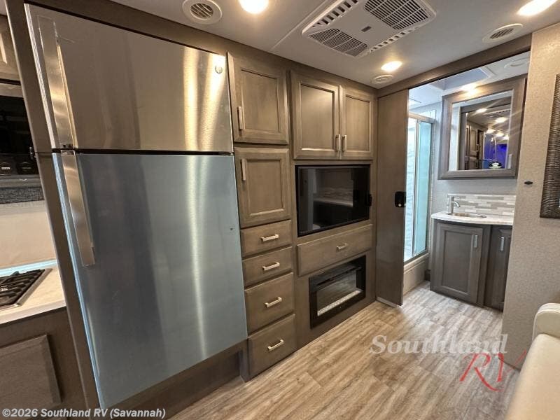 Enjoy traveling in this Magnitude Super C diesel motorhome that can easily sleep four or five! The rear bath provides a space saving sliding door, a 30" x 36" shower, a vanity with sink, and toilet. The Murphy bed allows versatility when you travel with friends providing plenty of seating and space during the day when the sofa is in place, then at night a 60" x 74" bed folds down. There is a closet in between the Murphy bed and 70" Dream Dinette which also provides seating during the day for meals or games, and can easily be transformed into sleeping space at night. Lastly, a 52" x 80" cab-over bunk that the kids will certainly be drawing straws for. And don't worry about having to stop for fast food since the kitchen includes a two-burner gas range with single induction cooktop, a convection microwave, and a stainless steel 16 cu. ft. residential refrigerator with an icemaker for your perishables! Oh, and did we mention fireplace and TV opposite the Murphy bed/sofa?!