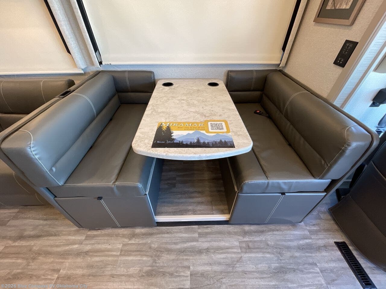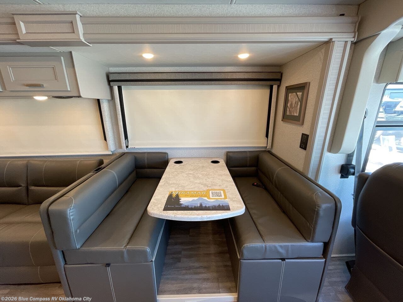 With any Miramar Class A gas motorhome by Thor Motor Coach you will find a durable welded tubular aluminum roof and sidewall cage construction, rotocast storage compartments, and frameless windows for a more sleek look. The 100-watt solar charging system with a power controller will allow you to do some off-grid camping, and you'll have an Onan RV QG 5500 gas generator on board for all your power needs. Each model includes the Rapid Camp+ multiplex wiring control system for quick and easy set up, and the Winegard ConnecT WiFi extender +4G will be perfect if you need to telecommute. Inside you'll find residential vinyl flooring, leatherette furniture, plus solid surface kitchen countertops for a truly luxurious coach!
