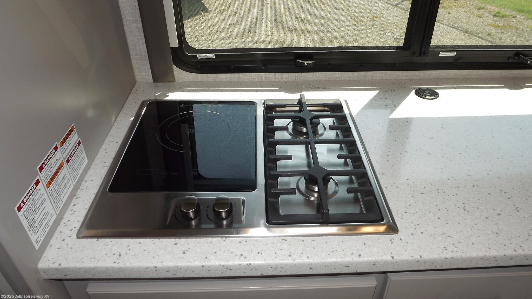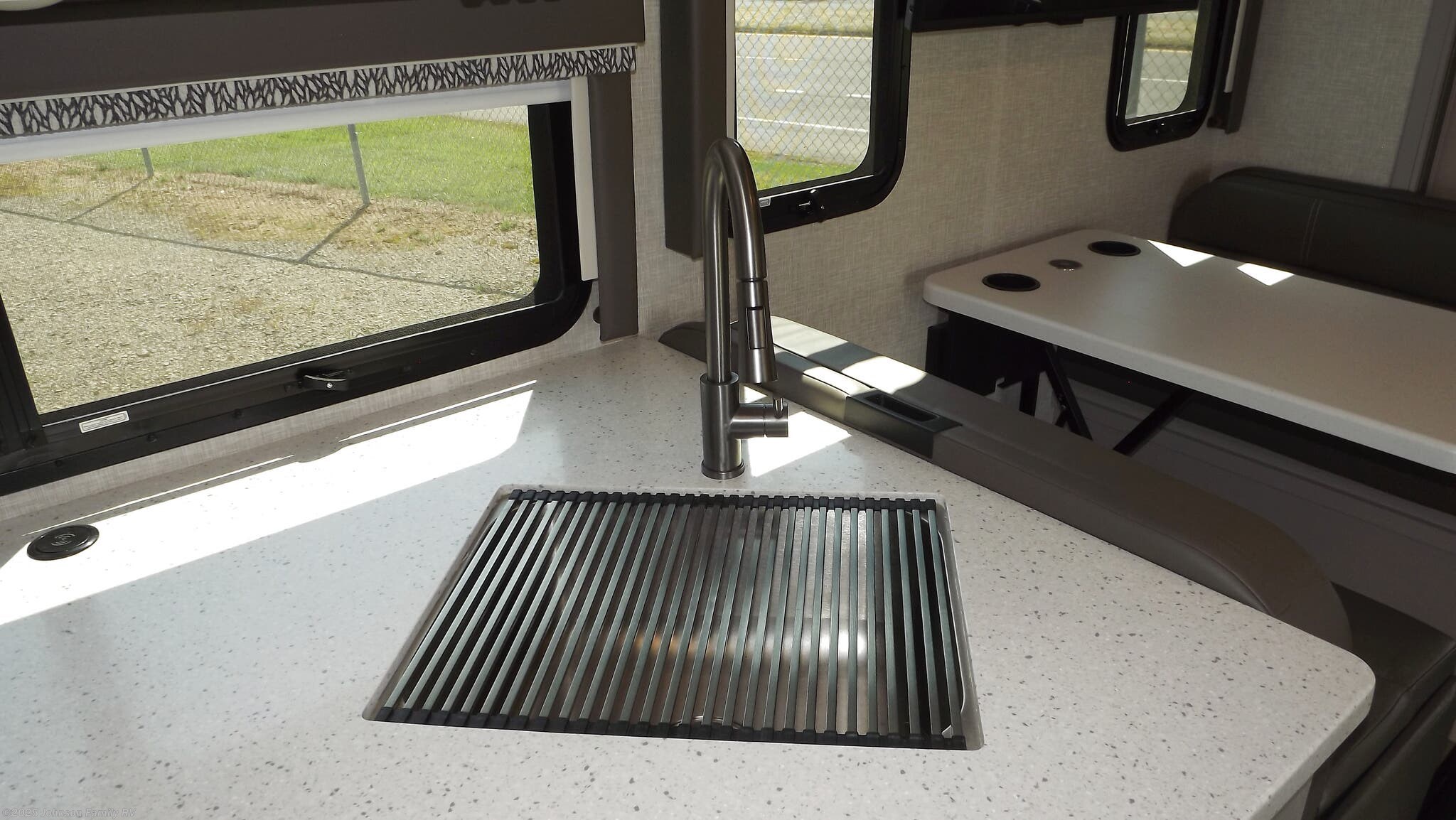 The Quantum is designed for social, family-friendly travel. The bunk over cab area provides a playful sleeping zone for kids or guests, while the rear bedroom offers a private retreat. The mid kitchen and mid living area arrangement optimizes flow, so meals, games, and movie time occur within easy reach. The booth dinette converts to additional sleeping space, ensuring maximum flexibility for eight travelers. Thoughtful interior touches include a beige interior and a clean, modern aesthetic that pairs with the grey and black exterior for a contemporary, easy-to-maintain look.