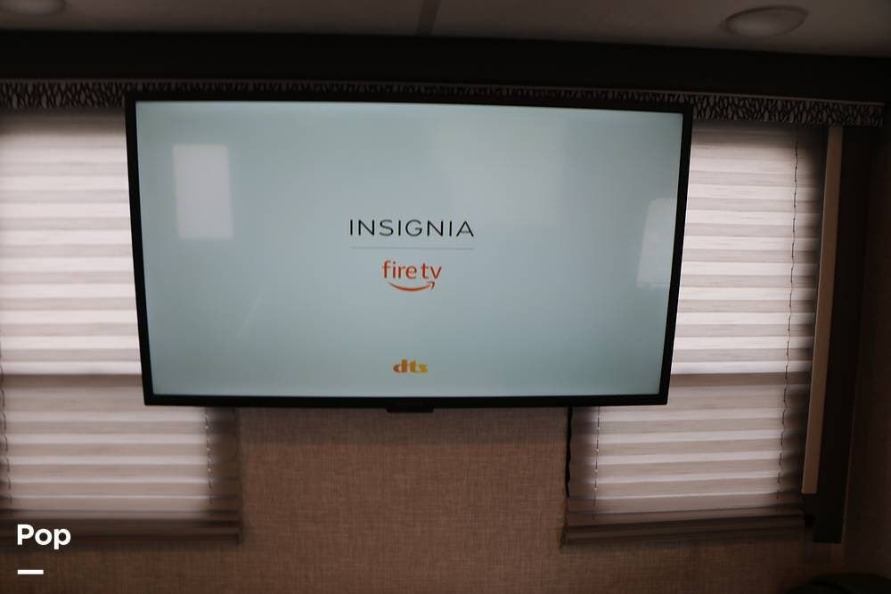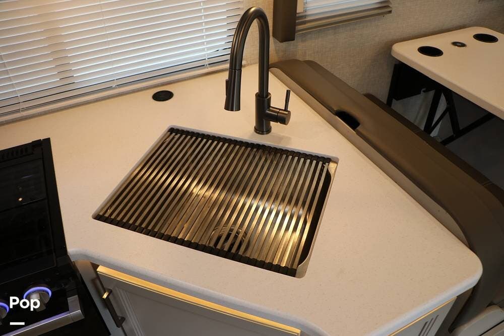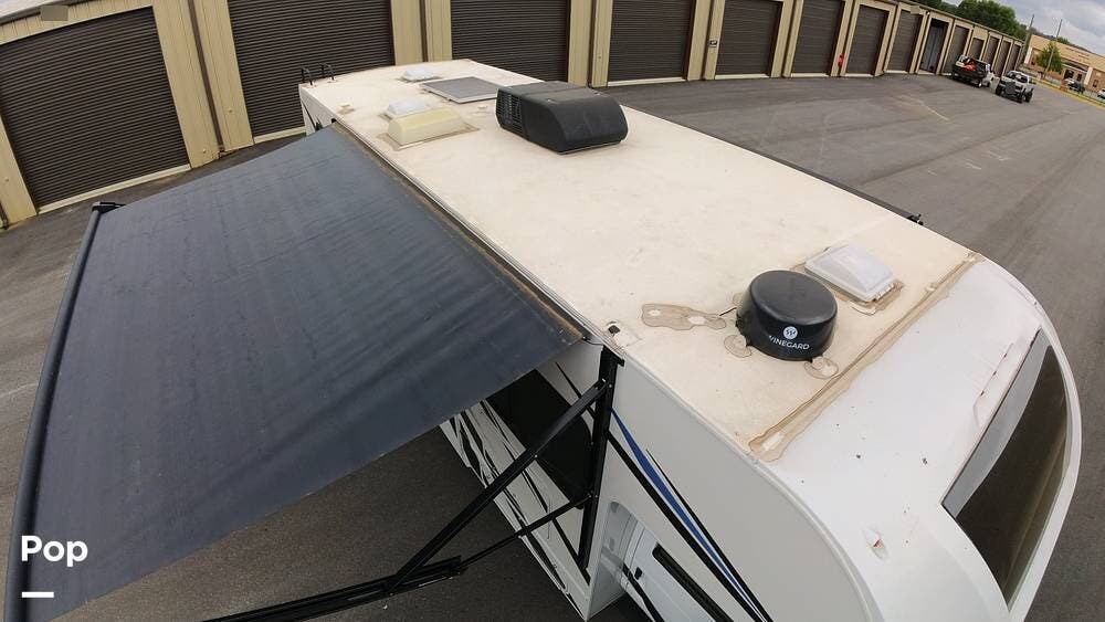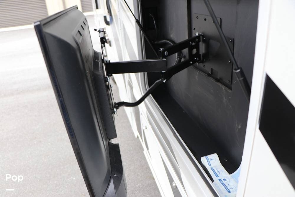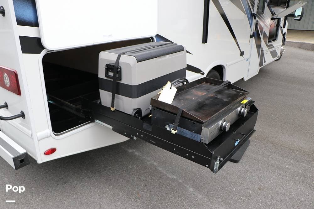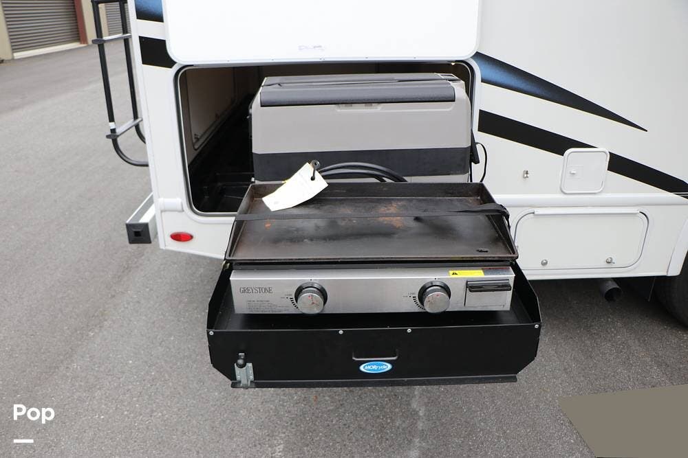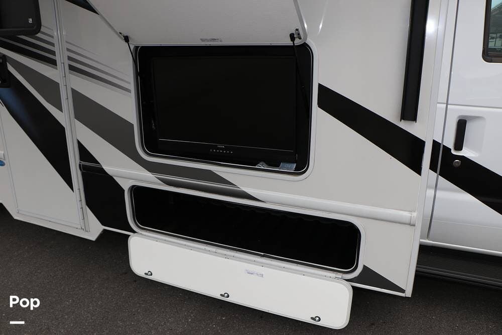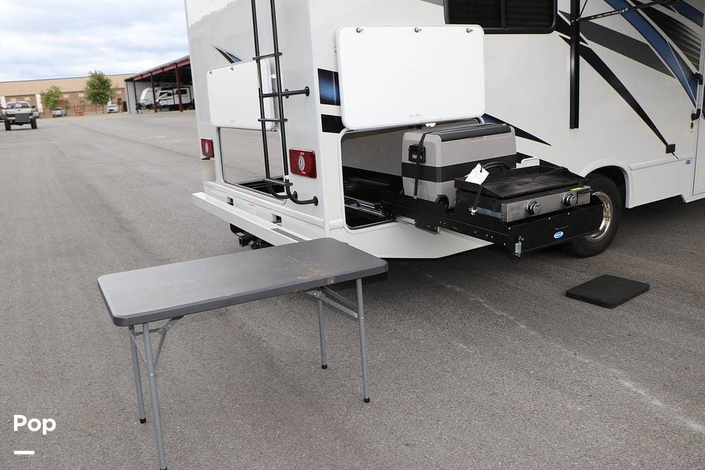 This RV is great for family outings or tailgating at your favorite team's events. The RV features a large power patio awning - an exterior TV mounted on a bracket that allows viewing from multiple angles. The exterior kitchen features a retractable refrigerator/freezer and a large electric griddle. The large rear storage compartment also has a plastic table that can be quickly set up to augment the outdoor kitchen and has access from three points for easy access to the items stored in this large space.