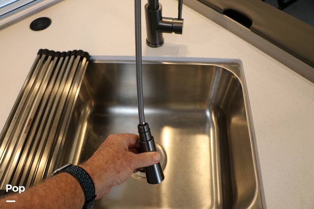 The two large recliners face the large flat-screen TV over the dinette. The galley is fully equipped with a microwave oven, a range hood fan/vent over the 3-burner gas stove top with glass cooktop cover, a conventional gas oven, a Farm-style kitchen sink (stainless steel) with a drainboard flexible cover, and a goose-neck faucet. The refrigerator/freezer is all electric, so it has approximately 30% more storage space and can run on the inverter/batteries, or electric shower power/generator.