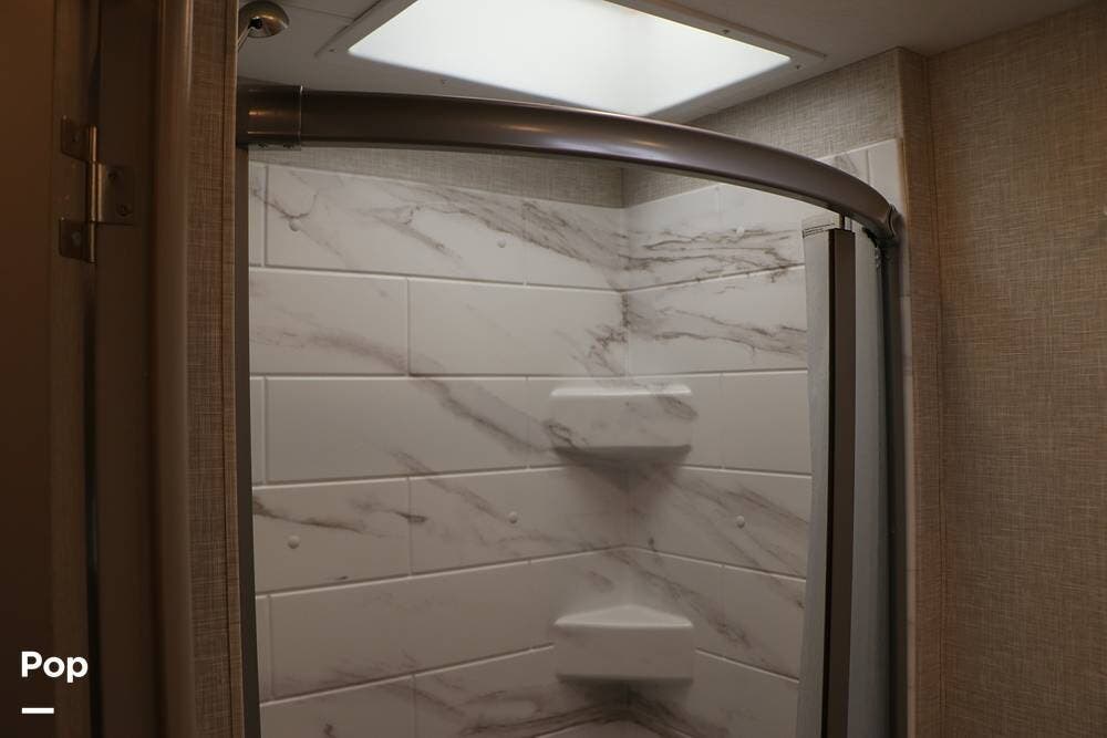 The bathroom features a large step-in shower with a skylight overhead, a sink with a large countertop, a spacious medicine cabinet with mirrored doors, and, of course, the toilet. The unit is equipped with a tankless water heater - so you never have to worry about running out of hot water!