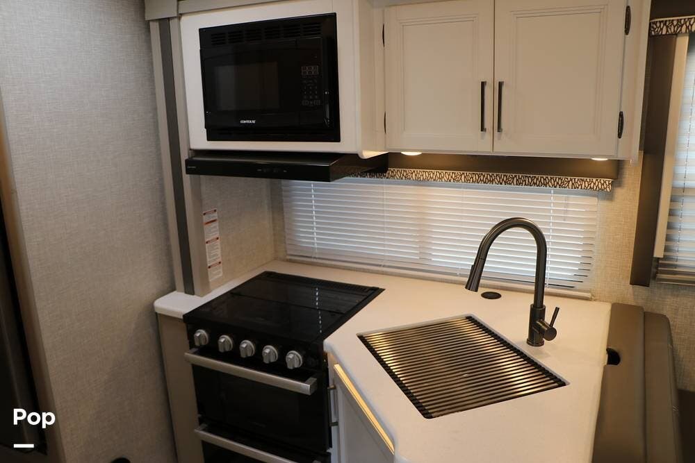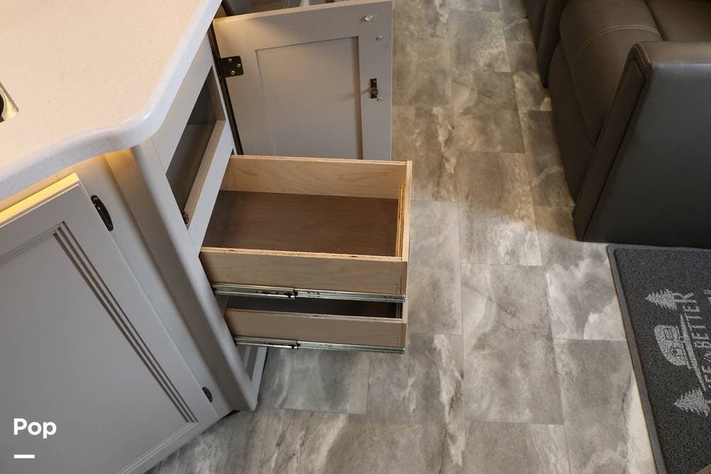 The layout is open and inviting, featuring a large slide-out that opens the living and galley areas. The rear queen bed is a pedestal bed that is accessible at any time, so someone can enjoy a nap while driving down the road.