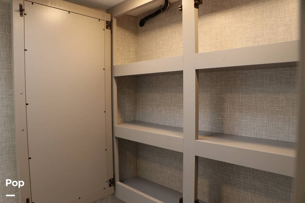 The master bedroom features the previously mentioned pedestal queen bed (no slides) and overhead cabinets and wardrobe closets on both sides. The wall-mounted TV allows you to watch your favorite shows or catch the big game in bed.