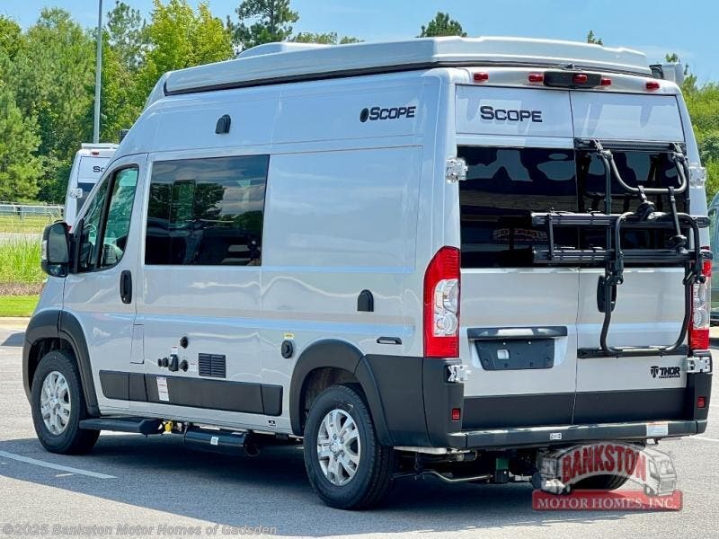 Each one of these Thor Motor Coach Scope Class B gas motorhomes are built for those who want to explore the great outdoors in comfort! They are front wheel drive and constructed with a RAM Promaster 1500 XT chassis, plus a 3,500 lb. trailer hitch with 4-pin connector so you can haul even more items with you. The side steps and large entryway make it easier to enter and exit the units, and the entryway screen door is an added bonus. The single door stainless electric refrigerator has a freezer for you to store your ice cream, and it is powered directly from the coach batteries which are charged by the quiet Onan® RV QG 2800 gas generator. Come find your perfect model and get out on the road today!