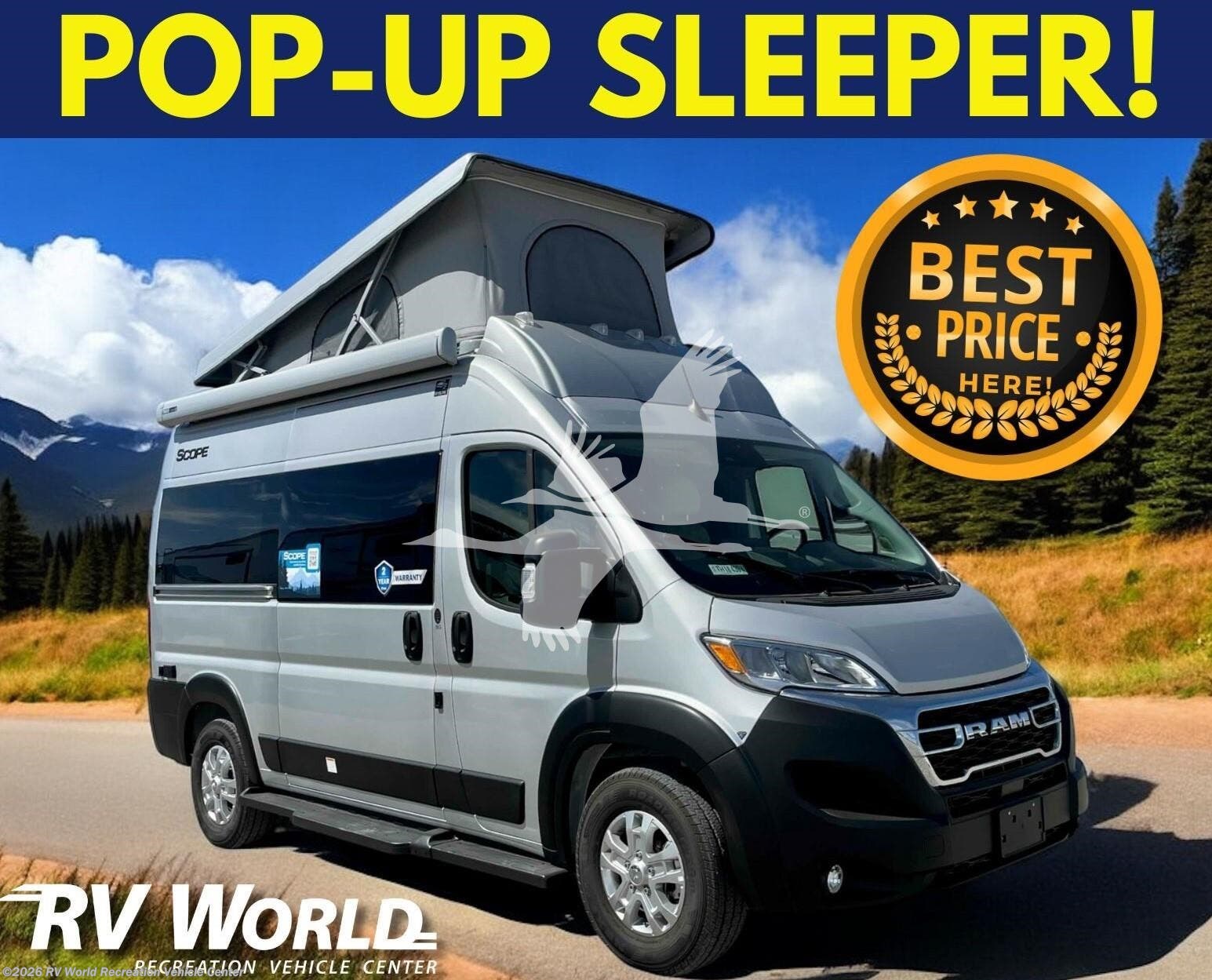 ****Stk#: CW18814.**** ***LOW MILES!!!*** The Scope® is the perfect vehicle for first-time RVers or seasoned adventurers who want a smaller setup without giving up comfort. Its compact size and clever design make navigating city streets and scenic byways a breeze while offering the essentials for life on the road. Easy to drive and even easier to park, this camper van is built for spontaneous getaways, quick stops, and freedom wherever your journey leads. Hit the road in the Scope® camper van, built on the Ram ProMaster® 1500 XT chassis and powered by a 3.6-liter V6 engine with front-wheel drive for a smooth ride. Advanced safety features like attention assist, traffic sign assist, active lane keeping assist, and blind spot assist help keep your journey stress-free. Tow your gear using the 5,000-pound hitch, and enjoy modern conveniences like adaptive cruise control, keyless entry, sleek aluminum wheels, and a backup camera for added peace of mind. You know you’re in for a good ride when you sit on the leatherette captain’s chairs that swivel and become part of the living area when parked. Getting off the grid is what van life is all about. Luckily, the 18G floor plan bathroom reflects that lifestyle with the cassette toilet, which is perfect for dry camping because it doesn’t require a dumping station. The built-in SkyBunk option offer more sleeping capacity. This camper van’s wet bath means you can enjoy a nice warm shower with the Truma® water heating system. After a long day of exploring, it’s just what you need. Other features on this Class B motorhome include: • Screen Door for Entryway • Electric Patio Awning • Touchscreen Dash Radio w/Apple Carplay & Android Auto • 3-Piece Windshield Privacy Shade • Back-up Monitor • Keyless Entry System • Single Door Refrigerator • 2 Burner Cooktop w/Glass Cover & Electric Start • Microwave Oven • 1000 Watt Inverter • Onan RV 2800 Quiet Gas Generator • Single Roof A/C • Solar Charge Controller w/Solar Panel • Exterior LP Connection • Holding Tanks w/Heat Pads • (2) Group 31 AGM House Batteries • Articulating Tablet Holder • Electronics Cabinet w/HDMI cable and USB Ports • Winegard ConnecT WiFi/4GITV Antenna