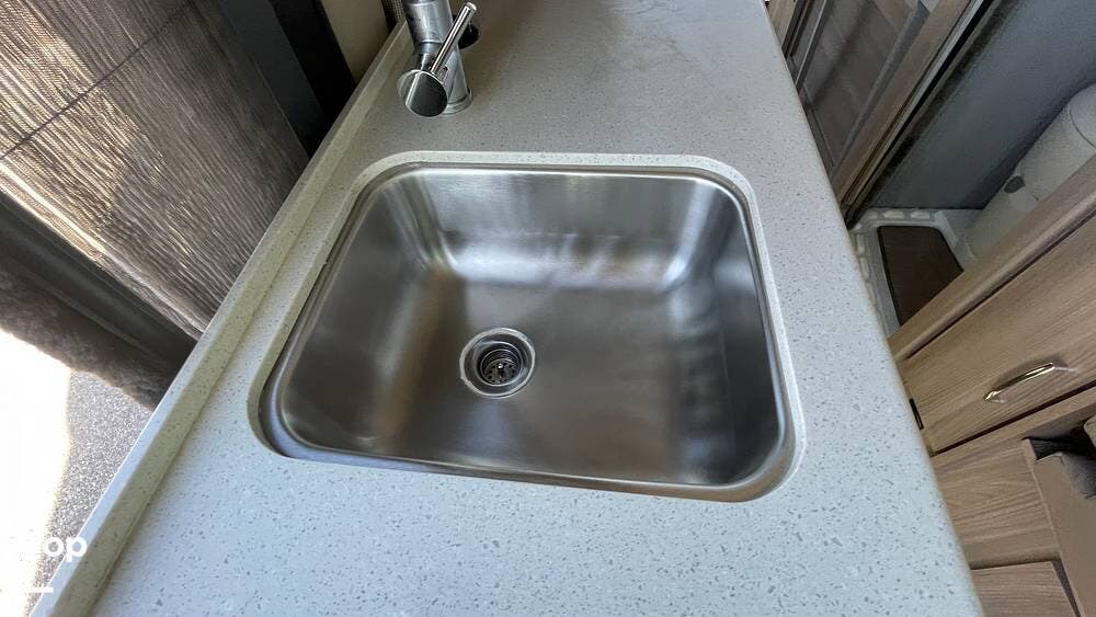The galley has an electric 1-burner cooktop and a stainless steel sink.