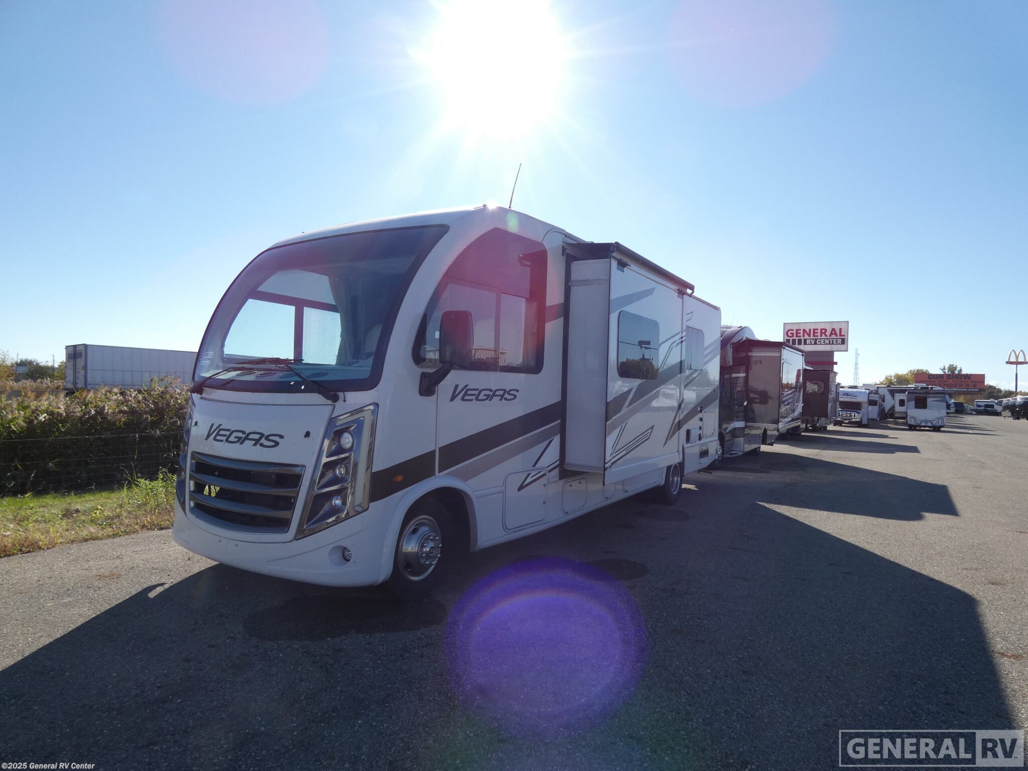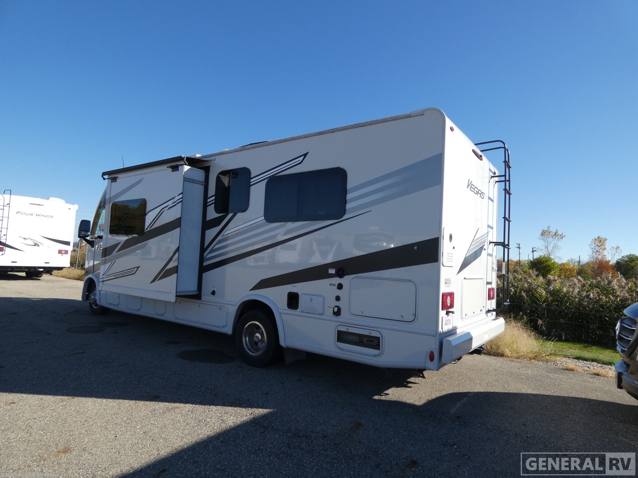 **Thor Motor Coach Vegas Class A gas motorhome 26.1 highlights:** * Rear Bedroom * Convection Microwave with Air Fryer * Tankless Water Heater * Private Lavatory and Sink * Theater Seating Slide Out * 32" Smart TV in Bedroom You're going to love the interior and exterior amenities found with this coach! The 73.7 cu. ft. of exterior storage will allow you to bring along hiking and fishing gear, and you can add an optional slide out griddle if you enjoy cooking outdoors. Once you unpack and head inside, you can relax on the theater seating that includes a removable pedestal table for dining space. And a 32" Smart TV is across from the sofa for easy viewing! It will be so easy to prepare meals each day in the kitchen with its two burner gas cooktop and convection microwave with an air fryer, and the 12V double door refrigerator can keep food fresh. You'll appreciate the rear bedroom with a privacy curtain, an RV queen bed, plus dual closets to keep your clothes wrinkle free. There is also additional sleeping space on the drop-down overhead bunk. This model also includes an independent shower across from the private toilet and sink, allowing two people to freshen up at once! You'll find excellent drivability with the Thor Motor Coach Vegas Class A gas motorhome! These RUVs (Recreational Utility Vehicle) have been built intentionally as a short Class A RV on a Ford E-Series chassis. They allow you to set up camp with ease thanks to the Rapid Camp+ multiplex system which is your all-in-one control center. You won't even have to get up while you're outside relaxing when you want the power patio awning to extend because you can open it with the click of a button on your phone. If you hook up a grill to the exterior LP connection, you'll also have a place to cook while you're outdoors, and the 100W solar panel with a controller helps you get away from the crowds. The HD-MAX exterior with graphics package will catch everyone's eye at the campground, and the premium one-piece Crossflex roof will last through years of use.