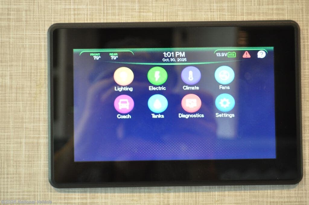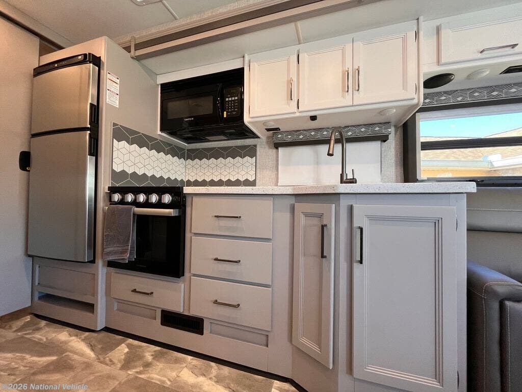 The 29M floorplan features a single slide-out, creating a spacious living area with theater seating, booth dinette, and overhead cab bunk, providing comfortable sleeping for up to six. Premium finishes and residential-style cabinetry give the interior a warm, inviting feel. The gourmet kitchen includes a three-burner range with oven, microwave, solid-surface countertops, and large refrigerator, making meal prep effortless on the road.