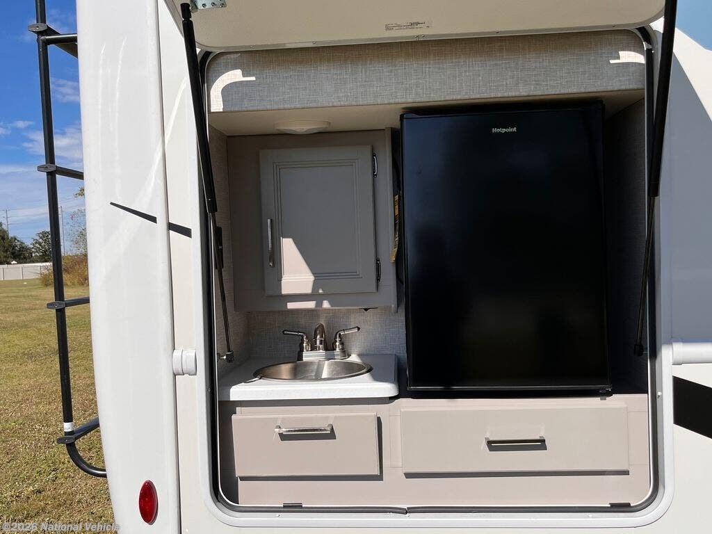 Outside, enjoy a power patio awning with LED lighting, ample exterior storage, and an exterior entertainment system, perfect for relaxing or entertaining under the open sky. With dual A/C units, generator, and automatic leveling, the Windsport 29M is ready for both weekend getaways and extended trips.