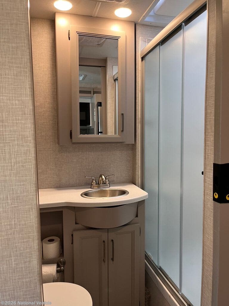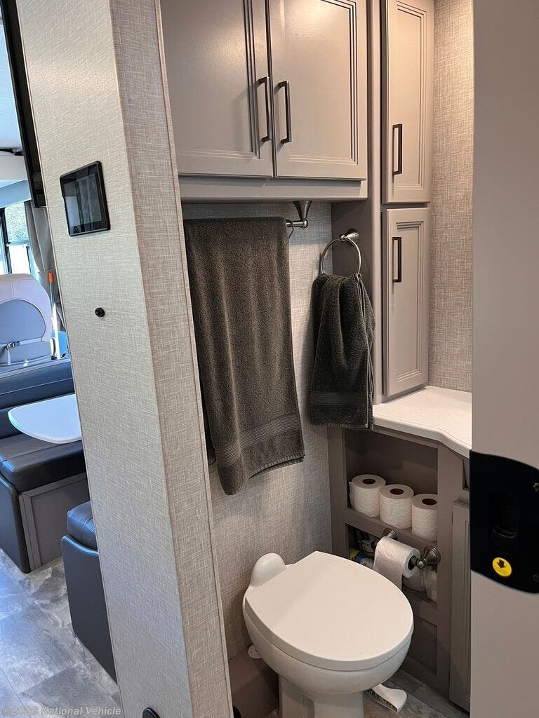 The rear private bedroom offers a king bed, wardrobe, and overhead storage, while the full bathroom includes a corner shower, vanity, and toilet, providing all the essentials for on-the-go convenience.