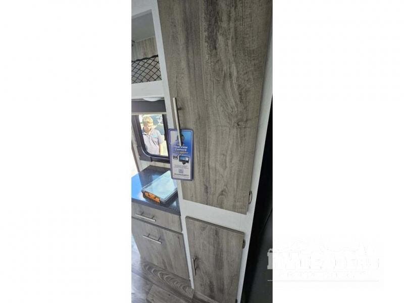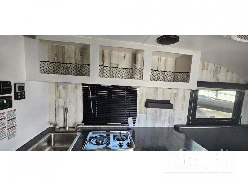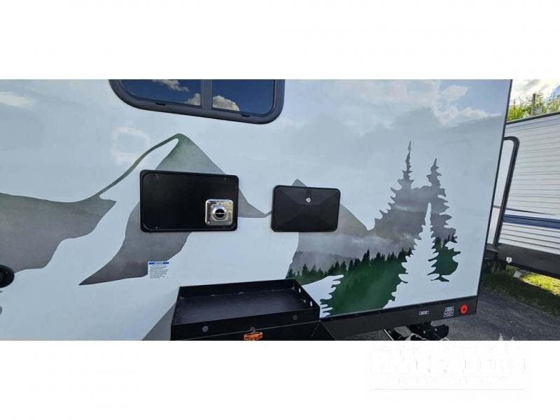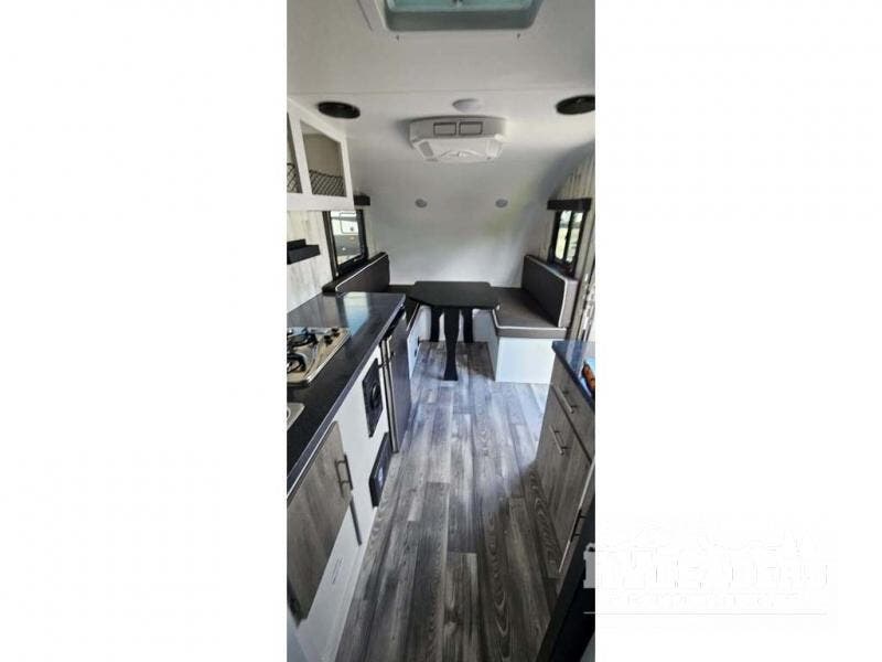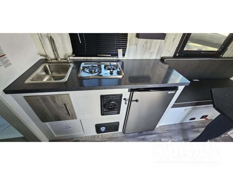 This Rove Lite can be the perfect couples adventure companion when you love the outdoors! This unit features a front booth dinette that transforms into a 54" x 74" bed to sleep on at night. There is also a full rear dry bath including a 24" x 36" shower and toilet with overhead storage for your towels and toiletries. A 13" x 15" sink is just outside the space saving sliding barn door for convenience. You will easily be able to whip up a meal or snacks with the two-burner cooktop, plenty of counter space, and a 3.3 cu. ft. 12V refrigerator for your perishables. There is storage throughout the inside for your camping necessities with several overhead cabinets and a pantry.