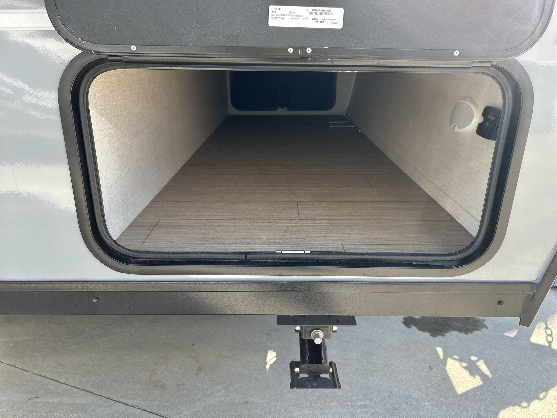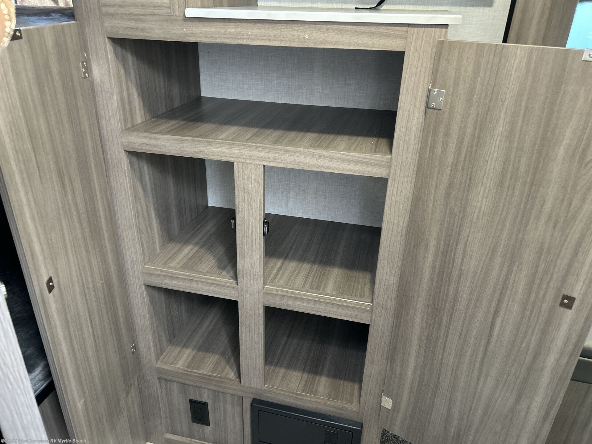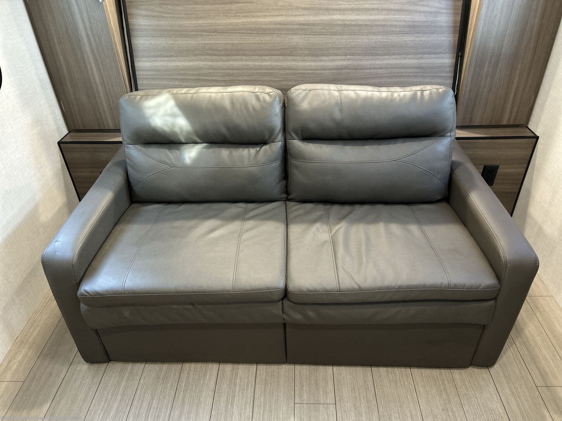 You and your larger group of eight can sleep comfortably in this travel trailer thanks to the Murphy bed up front, the double-size bunks in the rear and the 65" x 48" booth dinette! As the owner you will have the Murphy bed with StorMore bedside nightstands with a 110V outlet and USB charging to keep your phone ready for whatever is next, and the sofa provides a living area up front once the bed is put up into the wall. Your kids or guests will have 48" x 88" bunks and a wardrobe to place their things on the opposite side of the trailer. The cook can make warm meals in the kitchen or outside on the campfire café, and then choose to dine inside at the booth dinette or outside under the 14' power awning after grabbing your camping chairs from the exterior pass-through storage with motion-activated light.