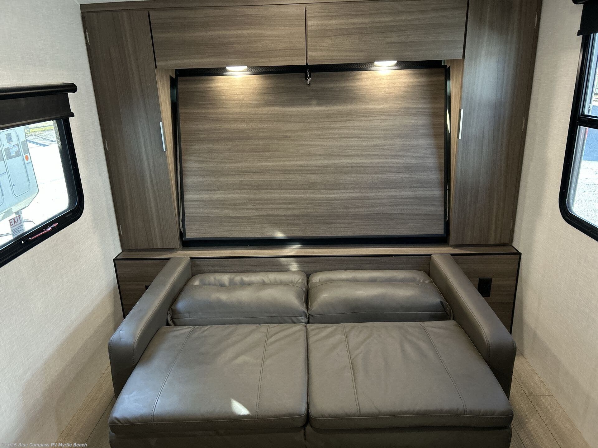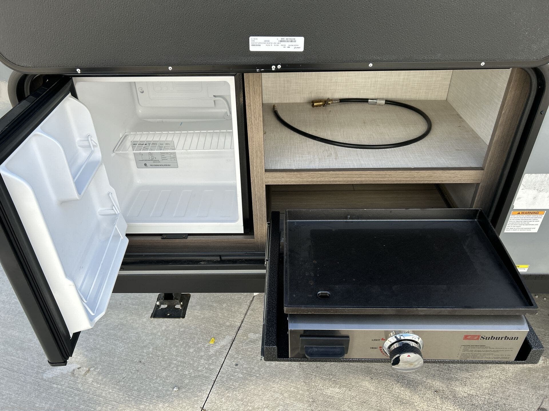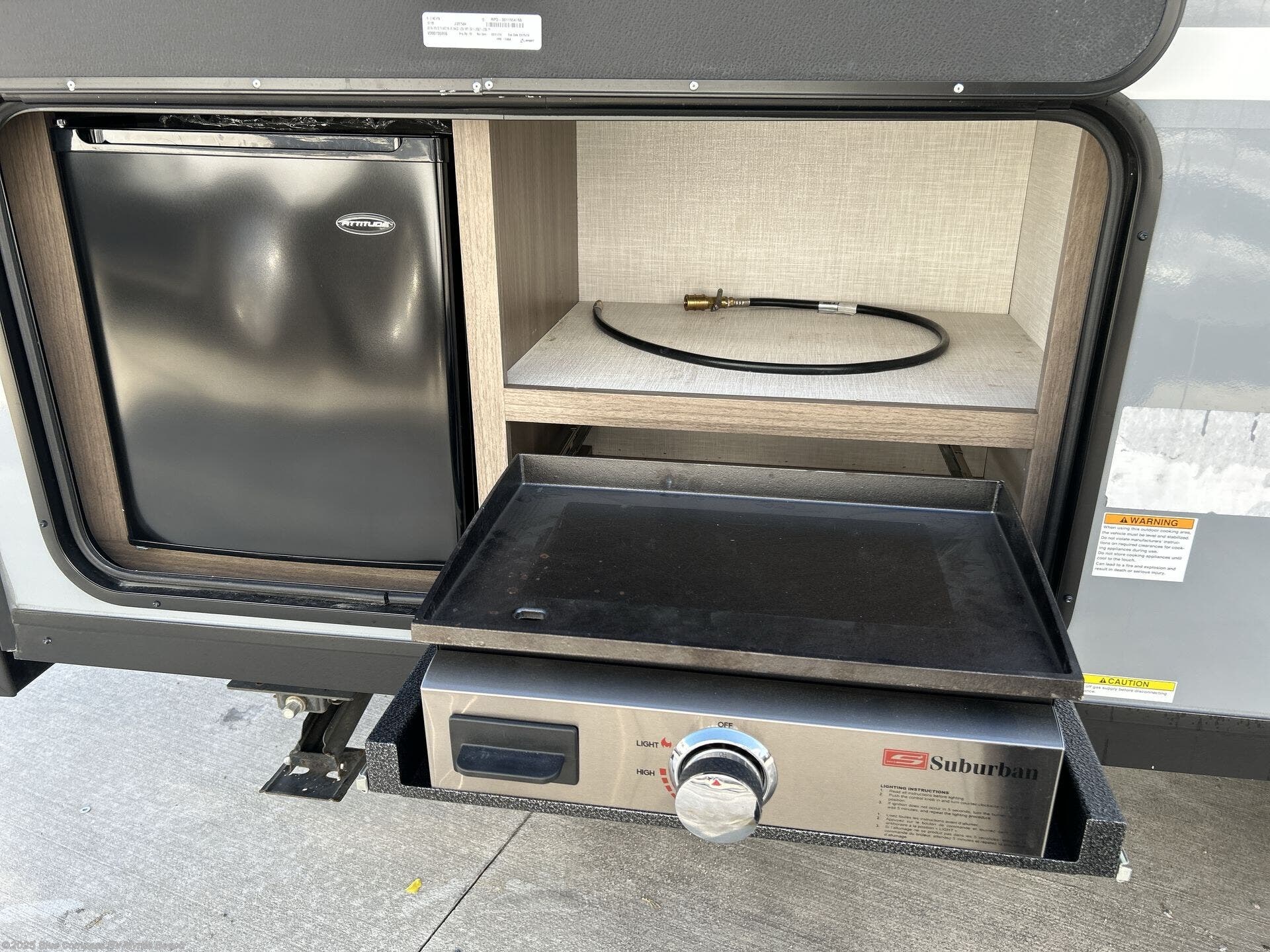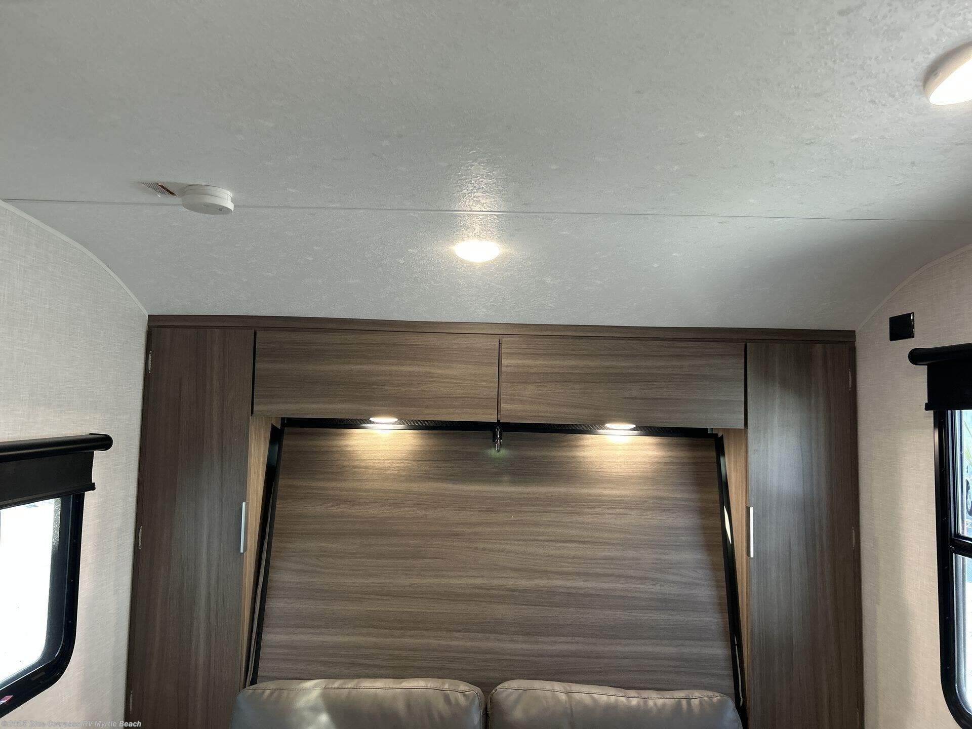 You and your larger group of eight can sleep comfortably in this travel trailer thanks to the Murphy bed up front, the double-size bunks in the rear and the 65" x 48" booth dinette! As the owner you will have the Murphy bed with StorMore bedside nightstands with a 110V outlet and USB charging to keep your phone ready for whatever is next, and the sofa provides a living area up front once the bed is put up into the wall. Your kids or guests will have 48" x 88" bunks and a wardrobe to place their things on the opposite side of the trailer. The cook can make warm meals in the kitchen or outside on the campfire café, and then choose to dine inside at the booth dinette or outside under the 14' power awning after grabbing your camping chairs from the exterior pass-through storage with motion-activated light.