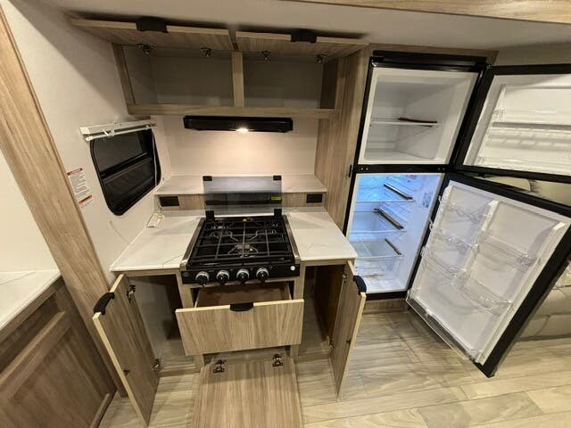 - Recessed 3-burner cooktop with backlit knobs and glass cover