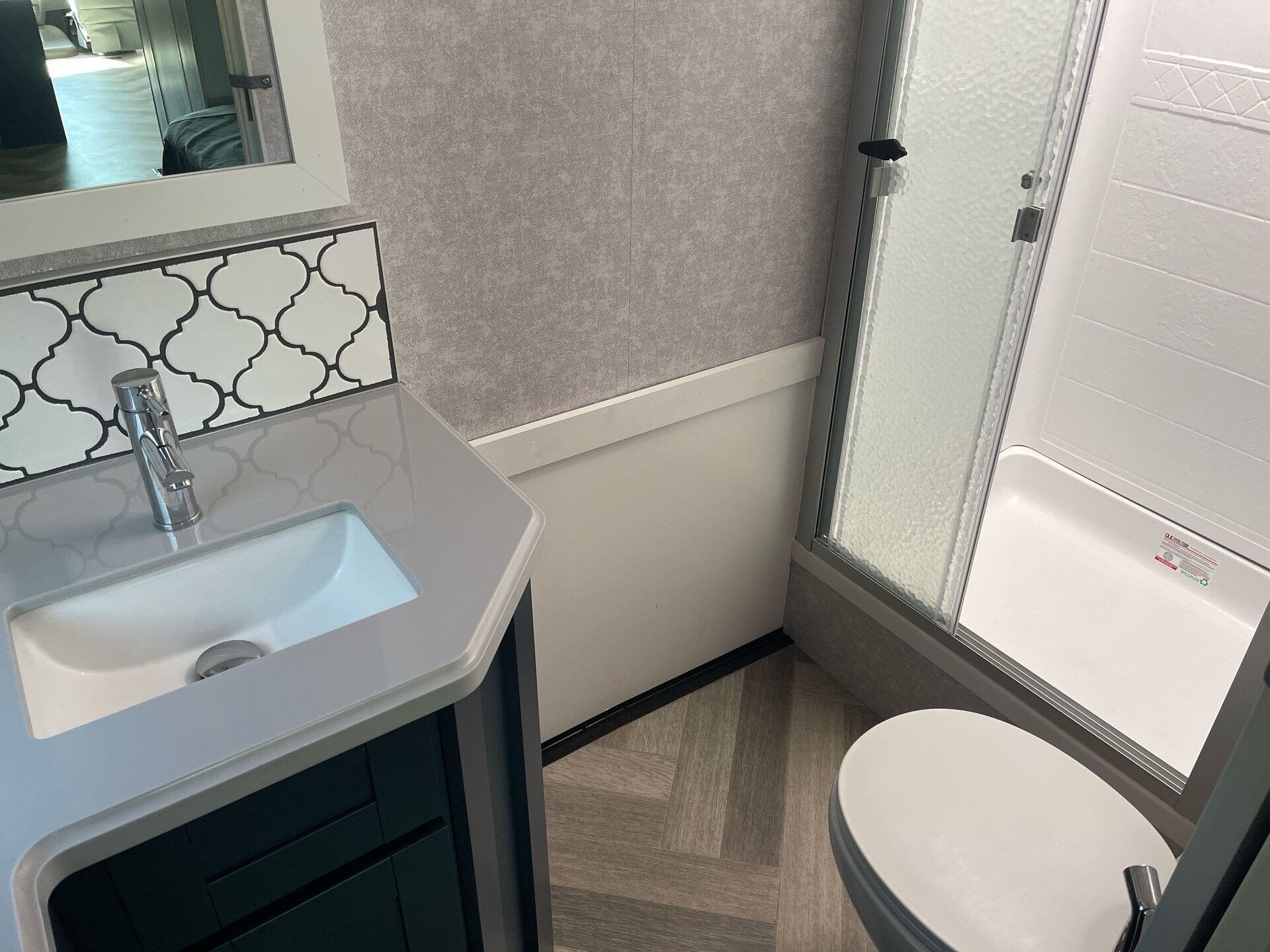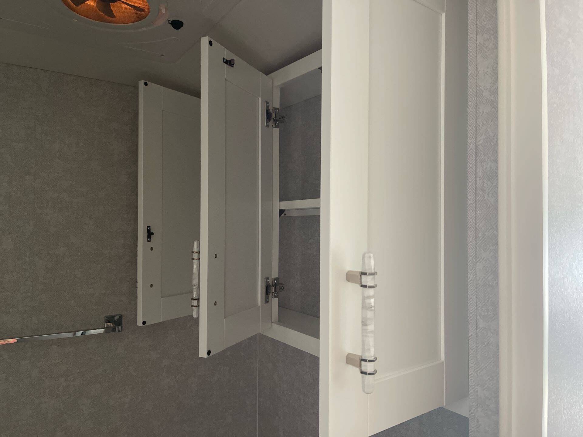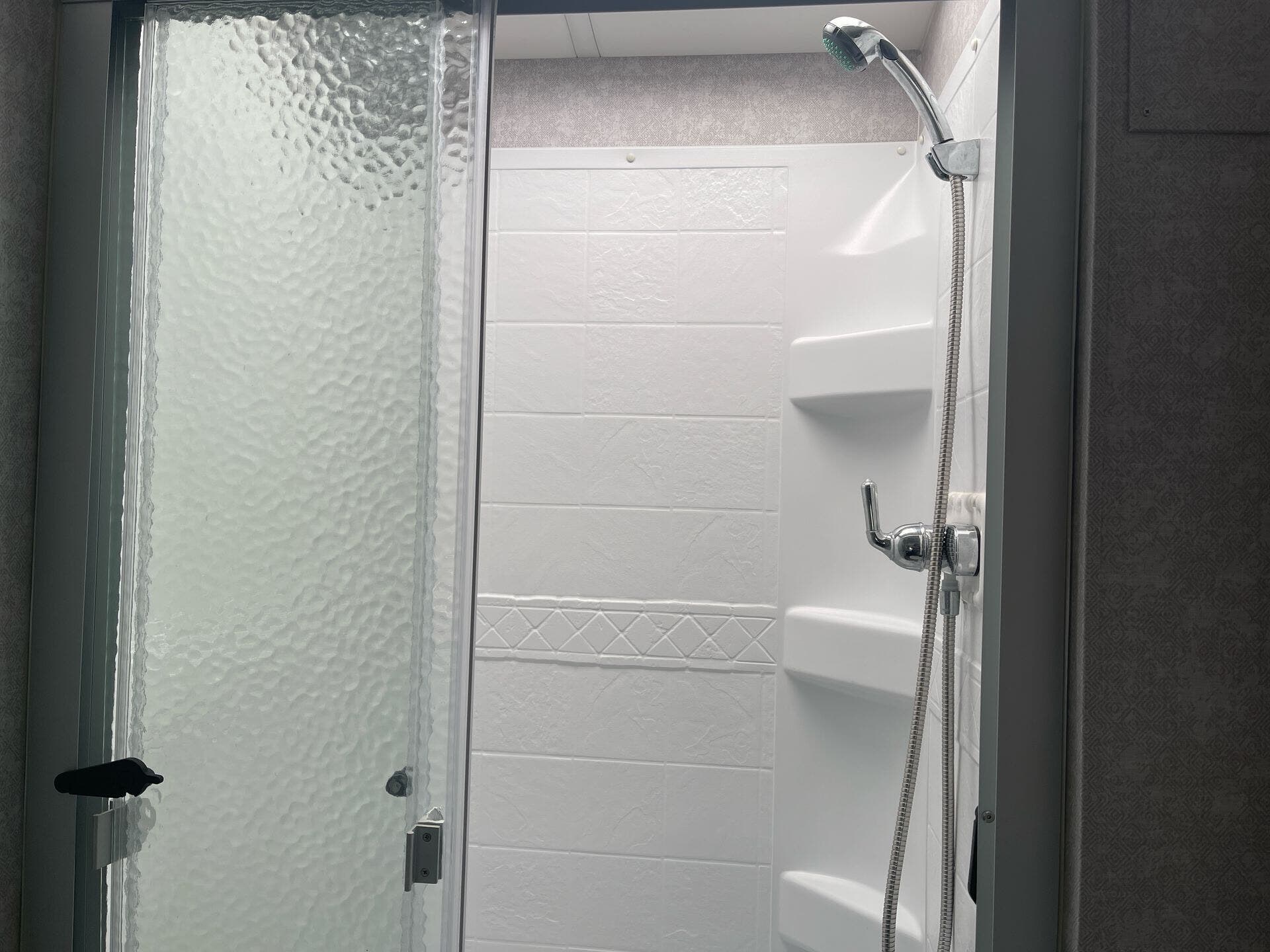 - Glass shower door and medicine cabinet in the bath