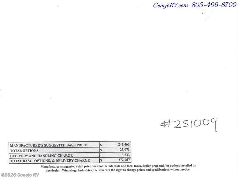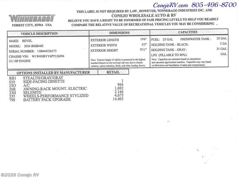 2024/2025 Winnebago Revel 44EC 2.5-2 AWD Sprinter Mercedes Turbo Diesel, 16.8KWH Lithionics System 15K Miles ***Our Price Only 149,990*** Built on a Fully Featured Mercedes-Benz® AWD Sprinter Chassis Mercedes-Benz® 2.0L 4 Cylinder Twin Scroll Turbo 211HP Diesel Engine with 332 lb-ft Torque, 9-Speed Automatic Transmission with Overdrive, 4-Wheel ABS Brakes, Auto Headlamps w/High Beam Assist, Active Braking Assist, Active Lane Keeping Assist, Blind Spot Assist, Attention Assist (Driver Alert), Traffic Sign Assist, Winnebago® x EcoFlow® Power Hub Pro 5-in-1 Power Management Controller, 3.6W Inverter, Solar Charger and Alternator Charger and Touchscreen Interface, Solar, Winnebago Power MAX 16.8kWh Lithionics® Lithium-Ion Battery, w/Dual Alternator Charging Capability, Bluetooth® Control and Pack Heating System, Power Lift Bed w/WinnSleep® Technology and Molded Pockets w/Zip Storage Below, Under-Bed Gear Garage Storage w/Strategically Placed L-Track Tie Downs, Flexible Showerhead, Wet Bath 31"x26", Removable Shelf Converts to Wet Storage Cabinet, Swiveling Cassette Toilet, Stowable Single Burner Induction Stove Top, Stainless Steel Sink, Compressor Driven Refrigerator/Freezer, Stowable Counter Top Extension, Pantry, Fold-Down Exterior Table, Pedestal Dinning Table With Bench Seat, MBUX® Touchscreen Multimedia Infotainment Center w/Navigation, Wi-Fi Hotspot, Intelligent Voice Control and Rear Camera, Cab Seats Slide/Swivel/Recline, Dual Airbags, Side Screen Door, Rear Screen Door, Powered Patio Awning With Bluetooth Controls, Water Center Control Panel Includes all Control Valves, Exterior Wash Station, 10' Sewer Hose, On-demand Water Pump, Heated Gray Water Holding Tank, Heated Freshwater Holding Tank, Galley Drain Pump, Winterization Package w/Labeled Valves, Roof Air Conditioner, Hydronic Heating System w/Multi-Zone Heating and LED Touchscreen Panel, Folding Privacy Shades for Front and Cab Door Windows, Performance Wheels and BF Goodrich® T/A® KO2 All-Terrain Tires, Tow Package.***Our Price Only $149,990*** We have some fantastic financing and take trades also! It is our #1 goal that your experience with our company is an enjoyable one with our staff of industry professionals, Conejo Wholesale Auto & RV, Exclusive Ventura County Dealer For Winnebago Navion, Revel, Solis, Ekko, and Travato, All Storyteller Products, Tiffin GH1, All Roadtrek Products, We Also Carry Some Quality Pre-Owned Motorhomes which come with Our 45 Day/1000 Mile In-House Warranty at No Charge, Conejo RV, 661 E. Thousand Oaks Blvd, Thousand Oaks, CA 91360, 805-496-8700, Open 7 Days, 9am to 6pm, All Coaches Fully Inspected, Serviced and Detailed, Come Experience the No Pressure No Haggle Sales Approach at Conejo RV, We Also Buy Clean Late Model Coaches, 1 Year Free Camping Membership Included Ask For Details! (***plus tax & license fees***)