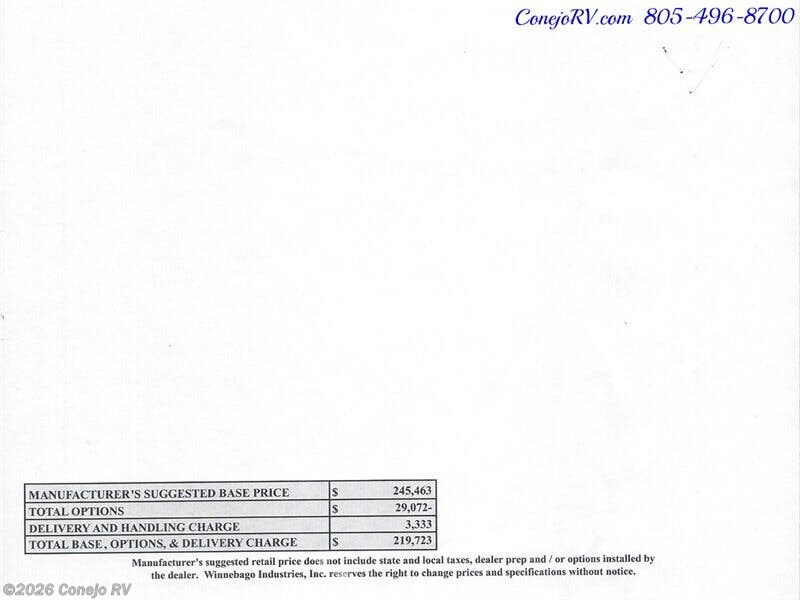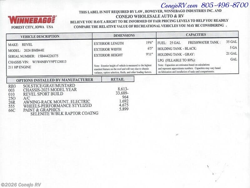 2024 Winnebago Revel Sport 44N AWD Sprinter Mercedes Turbo Diesel, 4.1kWh Lithionics Lithium System ***MSRP is $219,723, Our Discounted Price $144,990*** Built on a Fully Featured Mercedes-Benz® AWD Sprinter Chassis 2.0L High-Output, Turbo-Diesel 4-Cylinder, 9-Speed Automatic Transmission with Overdrive, Active Braking Assist, Active Lane Keeping Assist, Blind Spot Assist, Attention Assist (driver alert), Traffic Sign Assist, Adaptive Cruise Control, 4-Wheel ABS Brakes, 4.1 kWh Lithionics® Lithium-ion Battery w/Dedicated Second Alternator to Charge the System, Bluetooth Control and Pack Heating System, 2,000-Watt Inverter/Charger and 215-Watts of Solar, Rear Bedroom with Power Lift Bed Flex Bed System, Under Bed Storage Pockets, Under-Bed Storage with Removable Cargo Tie-Down Anchors, Flexible Showerhead, Wet Bath 31"x26", Swiveling Cassette Toilet, Stowable Single Burner Induction Stove Top, Larger 3.0 cu. ft. Compressor Driven Refrigerator/Freezer, Stowable Counter Top Extension, Pantry, Fold-Down Exterior Table, Pedestal Dinning Table With 3 Point Seat Belt, Tinted Dual-Pane Euro Acrylic Windows, Radio/Rearview Monitor System, MBUX® Touchscreen Multimedia Infotainment Center w/Navigation, Wi-Fi Hotspot, Intelligent Voice Control and Rear Camera, Cab Seats Slide/Swivel/Recline, Dual Airbags, Cruise Control, 12-volt Powerpoints, Trailer Hitch 5,000-lb. Drawbar/500-lb. Maximum Vertical Tongue Weight, Side & Rear Screen Door, Powered Patio Awning With Bluetooth Controls, Running Boards with Ground Effect Lighting & Rocker Trim with Mud Guard, Rear Ladder, Luggage Rack, Hydronic Heating System, Roof Air Conditioner, TrueLevel™ Holding Tank Monitoring System, On-Demand Water Pump, Heated Gray Water Holding Tank, Insulated/Heated Fresh Water Tank, 360 Degree Camera, Brand New & Just Arrived! ***MSRP is $219,723, Our Discounted Price $144,990*** ***Our Pricing is Inclusive of any Winnebago Customer Cash or Financing Promotions***We have some fantastic financing and take trades also! It is our #1 goal that your experience with our company is an enjoyable one with our staff of industry professionals, Conejo Wholesale Auto & RV, Exclusive Ventura County Dealer For Winnebago Navion, Revel, Solis, Ekko, and Travato, All Storyteller Products, Outside Van Syncline and Approach, Tiffin GH1, All Roadtrek Products, We Also Carry Some Quality Pre-Owned Motorhomes which come with Our 45 Day/1000 Mile In-House Warranty at No Charge, Conejo RV, 661 E. Thousand Oaks Blvd, Thousand Oaks, CA 91360, 805-496-8700, Open 7 Days, 9am to 6pm, All Coaches Fully Inspected, Serviced and Detailed, Come Experience the No Pressure No Haggle Sales Approach at Conejo RV, We Also Buy Clean Late Model Coaches, 1 Year Free Camping Membership Included Ask For Details! (***plus tax & license fees***)