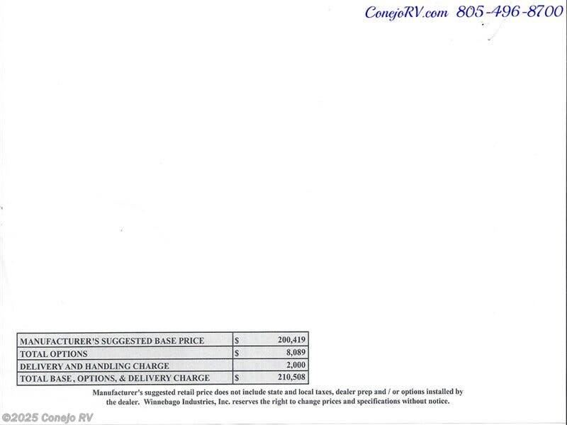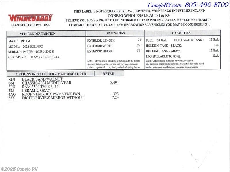 2024 Winnebago Roam 59RZ Accessibility Power Lift Power Lounge Full Galley *** Our Discounted Price is Only $149,990*** On The Ram ProMaster® Chassis, 280-hp, 3.6L V6 Gas Engine, 9-Speed Automatic 62TE Transmission, 180-amp. Alternator, 4-wheel ABS Brakes, Crosswind Assist, Blind Spot Monitoring, Full-Speed Forward Collision Warning Plus, Pedestrian Automatic Emergency Braking System, Post Collision Braking, Push Button Ignition, Braun UVL Wheelchair Lift (750 lb. weight capacity), Rear Power Convertible Power Lounge With Pop Up Expandable Dinning Table, Living Room Flat Screen TV, Fully Enclosed Private Bathroom with Flexible Showerhead, Swiveling Cassette Toilet, Assist Handle, Kitchen With Solid Surface Corian Countertop, Pull-out Wood Countertop Extension, Single Door Compressor-Driven Refrigerator/Freezer 12-volt, Large Basin Stainless Steel Sink, Greystone Microwave, AC/DC Load Center, Auxiliary Start Circuit, 2 Deep-Cycle Group 31 Batteries (AGM maintenance-free), Coach Battery Disconnect System, Automatic Dual-Battery Charge Control, 3K Inverter, 30-amp. Power Cord, Roof & Dash AC, 10" Multimedia Touchscreen Infotainment Center, Steering Wheel Controls, Rear Back Up Camera, Bluetooth®, JBL® Speakers and USB ports, Steering Wheel Controls, USB Ports Throughout, Captain Cab Seats Slide/Swivel/Recline, Driver and Passenger Airbags, Cruise Control, 3-Point Seat Belts, Power Steering, Power Door Locks w/Remote, Power Windows, On-Demand Water Pump, Water Center Control Panel Includes All Control Valves, Connection Points and Exterior Wash Station, Alloy Wheels, Tow Package, This Class B Has An Old School Style With Great New Modern Twists, Just Arrived, More Models Coming & Custom Orders Available. The All-New Accessibility Enhanced Winnebago® Roam Blends the Freedom of Independent Mobility with the Privacy and Comforts of Home *** Our Discounted Price is Only $149,990*** ***Our Pricing is Inclusive of any Winnebago Customer Cash or Financing Promotions***We have some fantastic financing and take trades also! It is our #1 goal that your experience with our company is an enjoyable one with our staff of industry professionals, Conejo Wholesale Auto & RV, Exclusive Ventura County Dealer For Winnebago Navion, Revel, Solis, Ekko, and Travato, All Storyteller Products, Outside Van Syncline and Approach, Tiffin GH1, All Roadtrek Products, We Also Carry Some Quality Pre-Owned Motorhomes which come with Our 45 Day/1000 Mile In-House Warranty at No Charge, Conejo RV, 661 E. Thousand Oaks Blvd, Thousand Oaks, CA 91360, 805-496-8700, Open 7 Days, 9am to 6pm, All Coaches Fully Inspected, Serviced and Detailed, Come Experience the No Pressure No Haggle Sales Approach at Conejo RV, We Also Buy Clean Late Model Coaches, 1 Year Free Camping Membership Included Ask For Details! (***plus tax & license fees***)