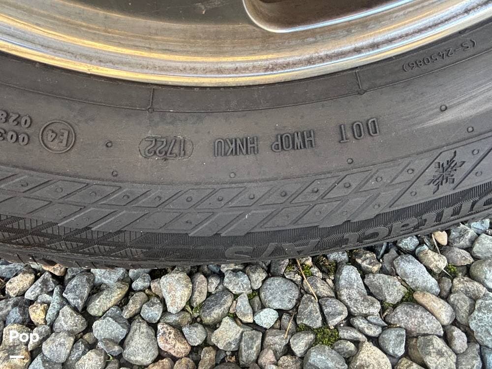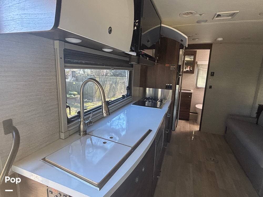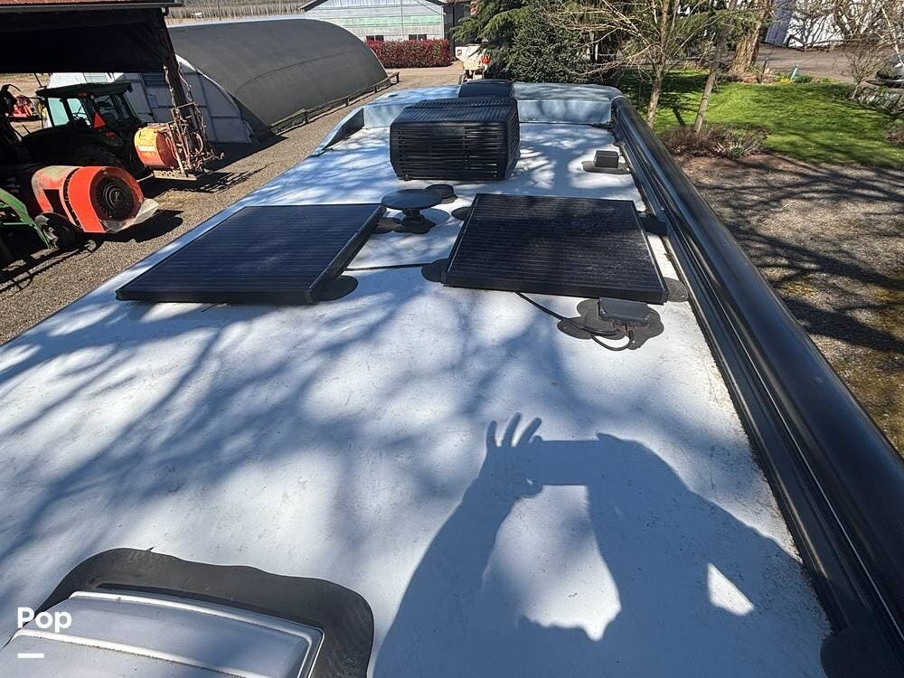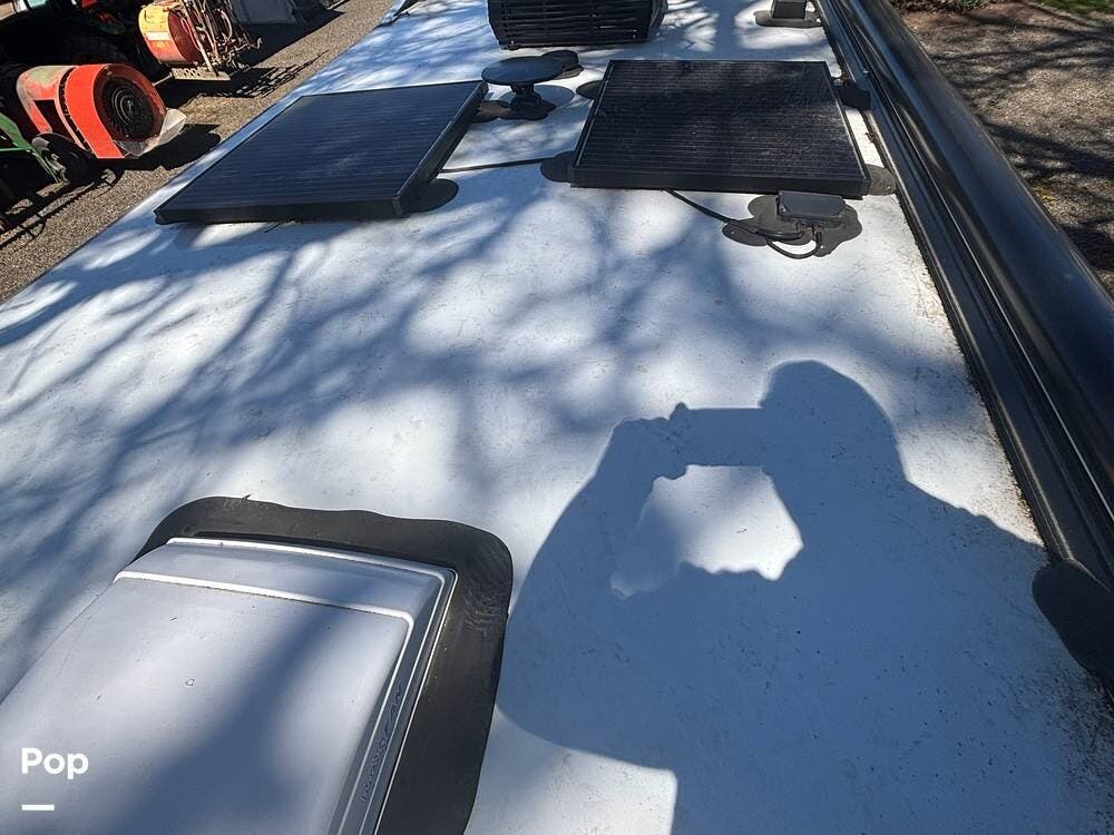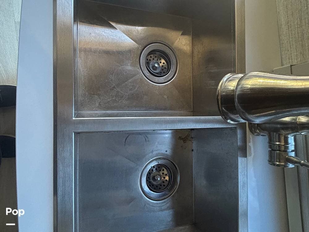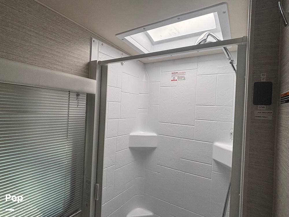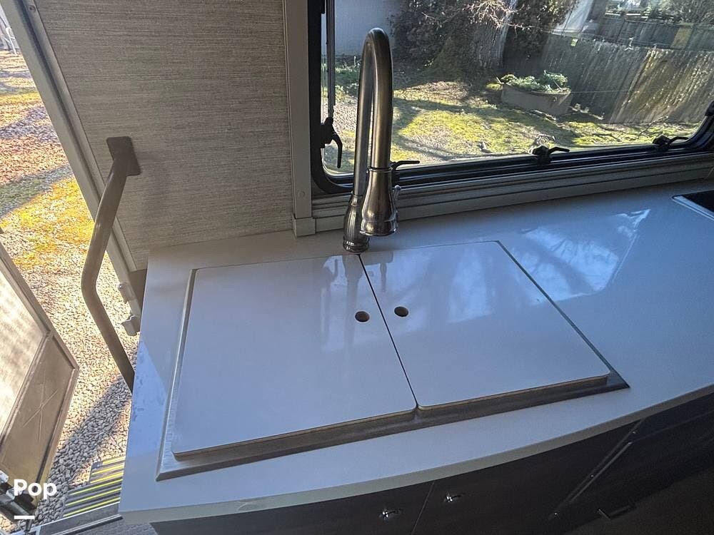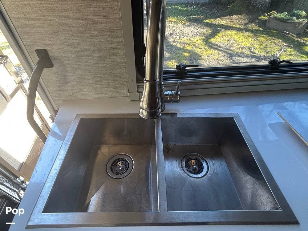 Inside, you'll find a full kitchen with stove, microwave/convection oven, refrigerator/freezer, pantry, double sink, and dining table with chairs. The living area includes a slide-out, sofa sleeper, skylight, air conditioning, heat, and full bath with shower.