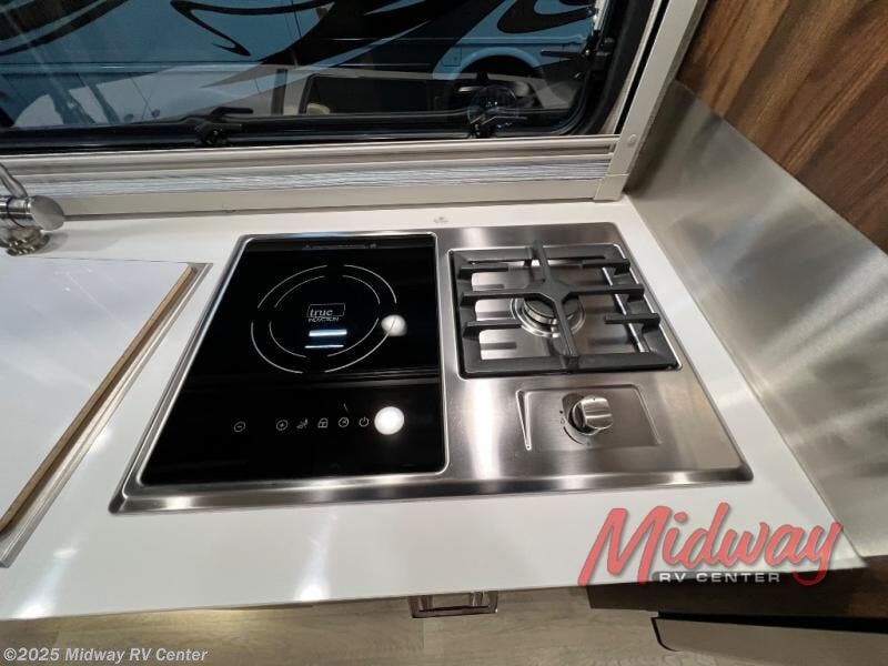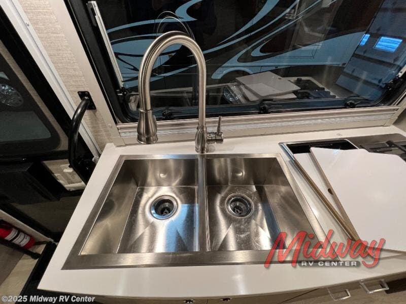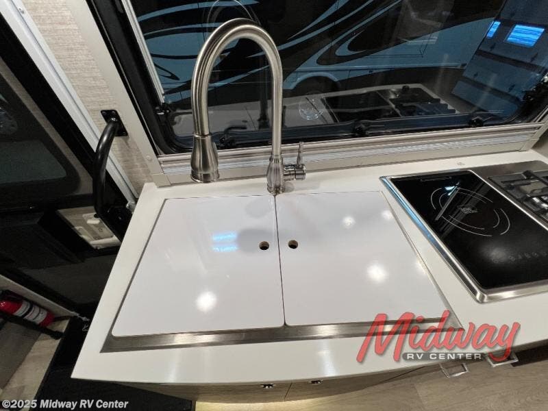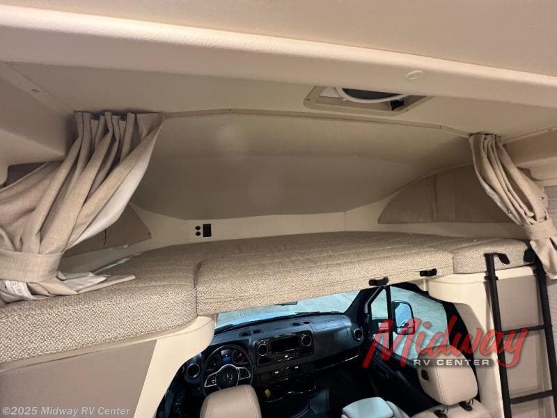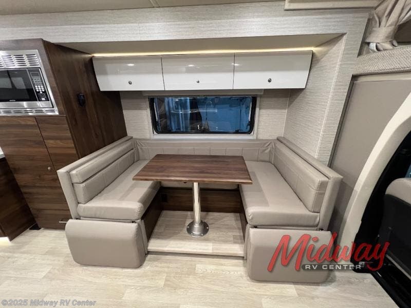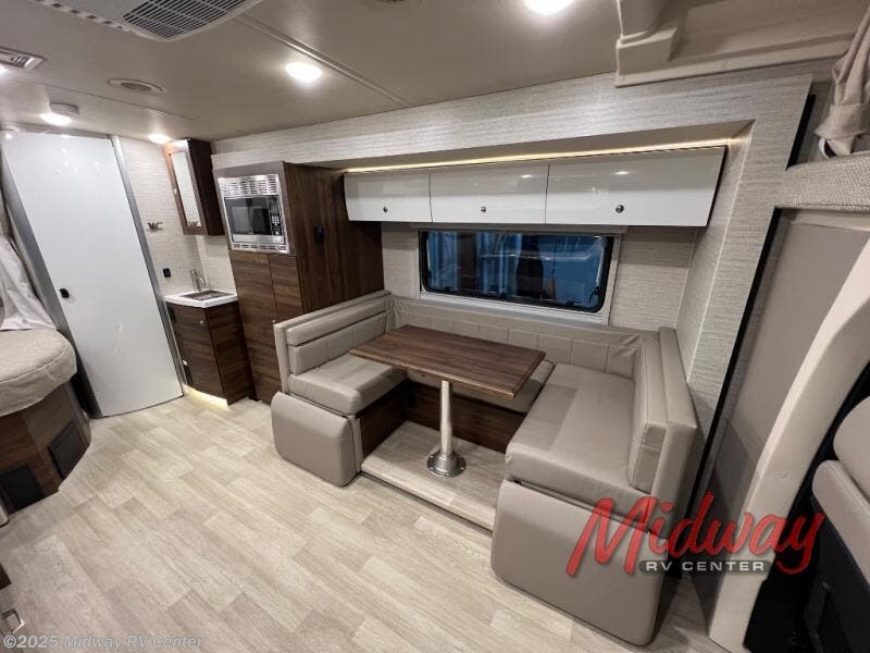 Your family will enjoy seeing the views riding down the road in this View Class C diesel motorhome. The kids can play games at the U-shaped dinette that has three seatbelts, and once at your destination, the dinette footrests may come in handy. The driver and passenger will enjoy the heated, power cab seats that can swivel for more seating. Everyone will enjoy the look and convenience of the curved cabinets, the lighted soft-close galley drawers, and the sprung-cushion dinette seats. The cross-coach storage holds larger items, and the above-bed Anything Keeper storage stows things away such as your cellphone. You might like to add the theater seating option with swivel tables in place of the U-shaped dinette if you don't need that extra sleeping space. The cook will appreciate the kitchen appliances to make meals, and the bathroom has the bath sink just outside the door.