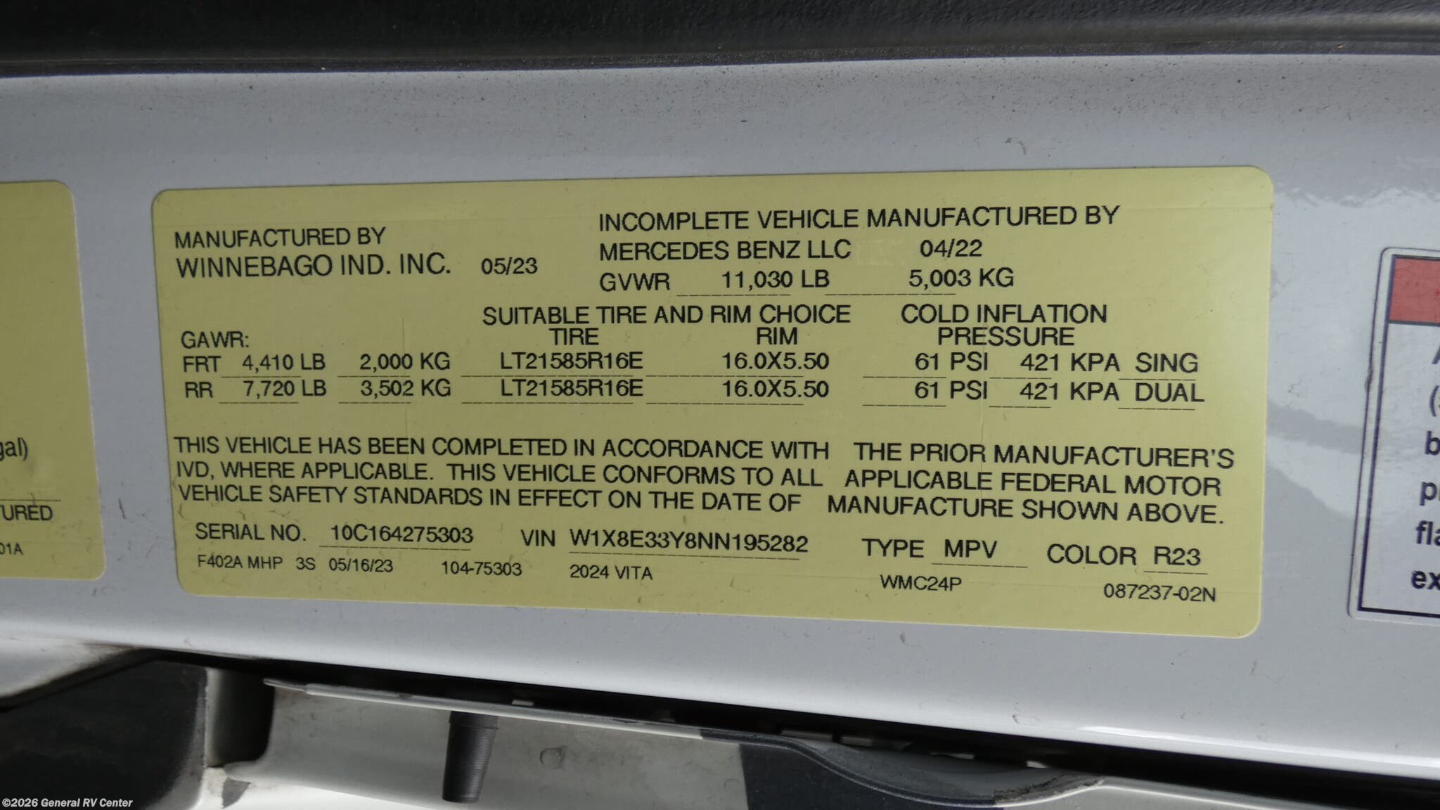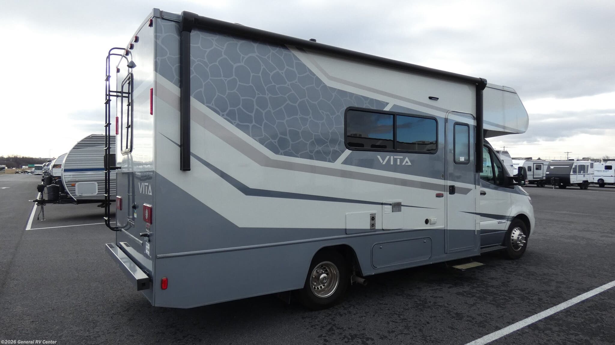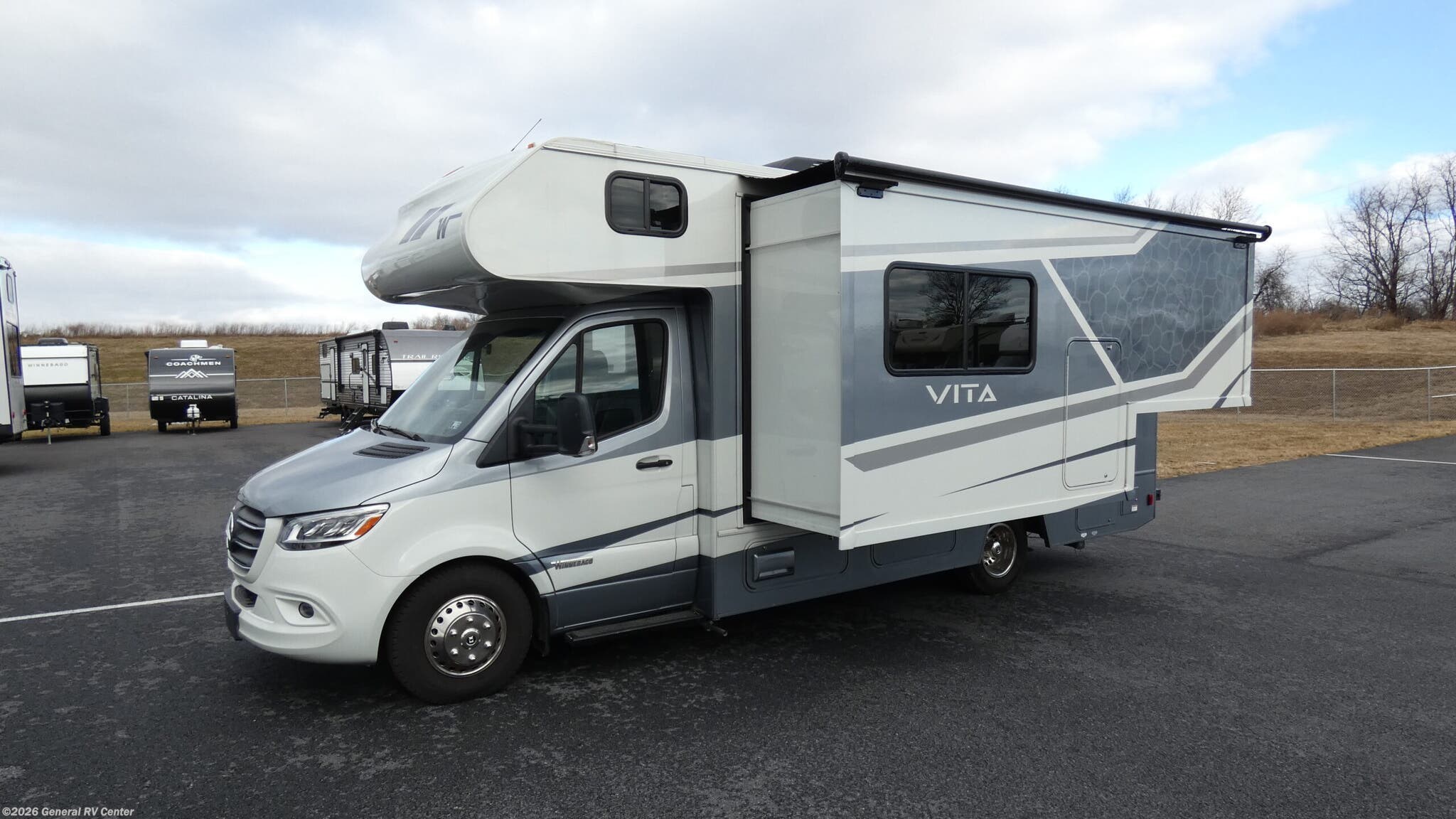 Experience the open road like never before with the 2024 Winnebago Vita 24P. This RV is designed for those who crave adventure without sacrificing comfort. Built on a robust Mercedes-Benz Sprinter 3500 chassis and powered by a V6 engine, the Vita offers a smooth and reliable ride. Its compact length of just over 24 feet makes it easy to maneuver, while still providing ample living space inside. The thoughtfully designed floorplan features a front living area that invites you to relax and unwind, complete with a convertible dinette that transforms into an extra sleeping space. Step into the center kitchen, equipped with a full-size electric refrigerator, three-burner cooktop, and convection microwave, ensuring you have everything you need to whip up your favorite meals. The rear bath, with its convenient sliding bi-fold door, offers privacy and functionality. Enjoy restful nights on the comfortable queen bed, with additional sleeping options available in the overhead cab bed. With a fresh water capacity of 37 gallons and gray and black water tanks each holding 41 gallons, the Vita is ready for extended adventures. The 15-foot powered retractable awning extends your living space outdoors, perfect for enjoying the scenic views at your campsite. For more details and to see this model in person, visit your nearest General RV dealership. Let the 2024 Winnebago Vita 24P be your home away from home on your next journey!