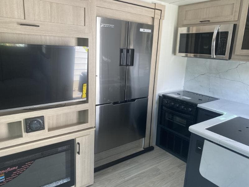 The 2024 Winnebago Voyage 2730RL is a brand-new travel trailer designed to offer a luxurious and comfortable experience for those who love the open road. This RV is a perfect blend of modern amenities and robust construction, making it an ideal choice for both short getaways and extended adventures. **Exterior Features:** - Built on an NXG Engineered Frame, ensuring durability and stability. - Equipped with aluminum wheels and a spare tire for added convenience. - Features a seamless TPO roof membrane and FILON MAX sidewalls for enhanced weather resistance. - Includes a roof ladder for easy access and maintenance. - All LED outside lighting ensures visibility and safety during nighttime travels. - Comes with a 5.1 auto stabilizing system for easy setup at your campsite. **Interior Living Spaces:** - The interior boasts ductless flooring and ceiling LED lighting, creating a bright and open atmosphere. - Tinted safety glass windows provide privacy and protection from the sun. - A tri-fold sofa and a cozy fireplace offer a comfortable space to relax and unwind. **Dining and Kitchen Amenities:** - The kitchen features pressed type countertops and a single bowl undermount sink with a high-rise pull-down faucet. - A 12v 15cf refrigerator and a 30-inch convection microwave make meal preparation a breeze. - The recessed cooktop with backlit knobs, glass cooktop cover, and oven provide versatile cooking options. - A power vent fan ensures proper ventilation while cooking. **Electronics and Connectivity:** - An all-in-one control panel simplifies the management of various systems. - USB and USBC charge ports are conveniently located throughout the RV. - Prepped for tire pressure monitoring, Furrion backup camera, and King Omni antenna WiFi. - Equipped with a smart TV, JBL Aura Cube media center, and premium indoor and outdoor speakers for entertainment. **Sleeping Arrangements:** - A 60x80 queen bed with bedside outlets and USB ports ensures a restful night's sleep. - Underbed storage provides additional space for personal belongings. **Bathroom Facilities:** - The bathroom includes a large medicine cabinet with a mirror and an undermount stainless steel sink. - A glass shower door and shower skylight enhance the bathing experience. - Features a porcelain toilet, bathroom heat and AC, and a power vent fan for comfort and convenience. **Mechanical and Utility Features:** - A 200w solar panel and side mount solar expansion prep support sustainable energy use. - Equipped with a 30-amp solar controller and inverter prep for efficient power management. - Two 30# LP bottles and a 50-amp service with a 36-ft cord and light ensure reliable energy supply. - A 55-amp 12v DC converter, 15k AC with True Trax ducting, and 2nd AC prep provide climate control. - A 30k furnace, 10-gallon hot water tank, and 12v tank pad heaters ensure comfort in various weather conditions. - The universal enclosed docking station and camp side spray port add convenience for outdoor activities. The 2024 Winnebago Voyage 2730RL is a well-equipped travel trailer that combines luxury, functionality, and modern technology, making it an excellent choice for travelers seeking adventure without sacrificing comfort. ??