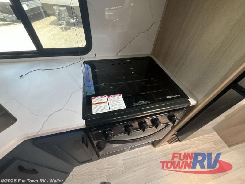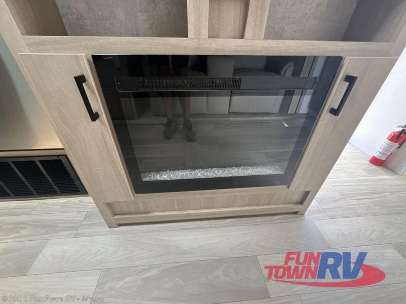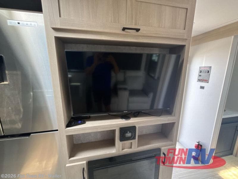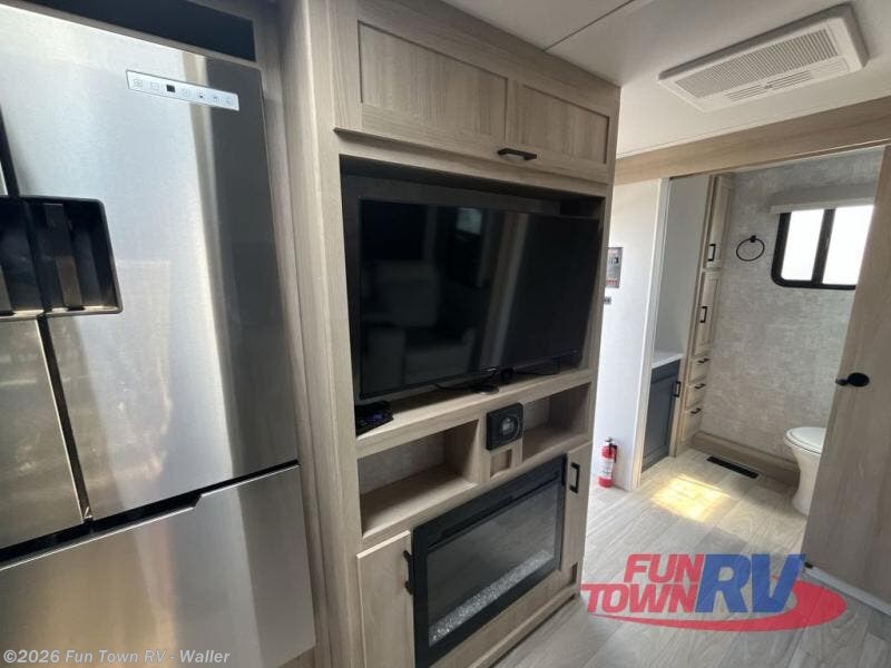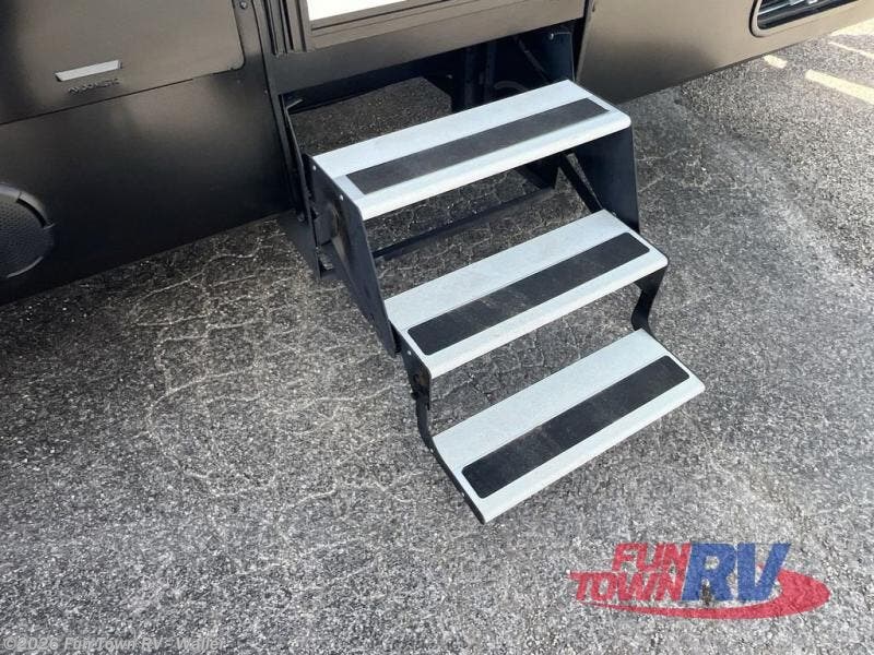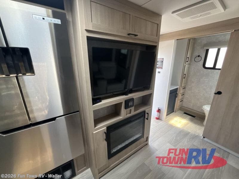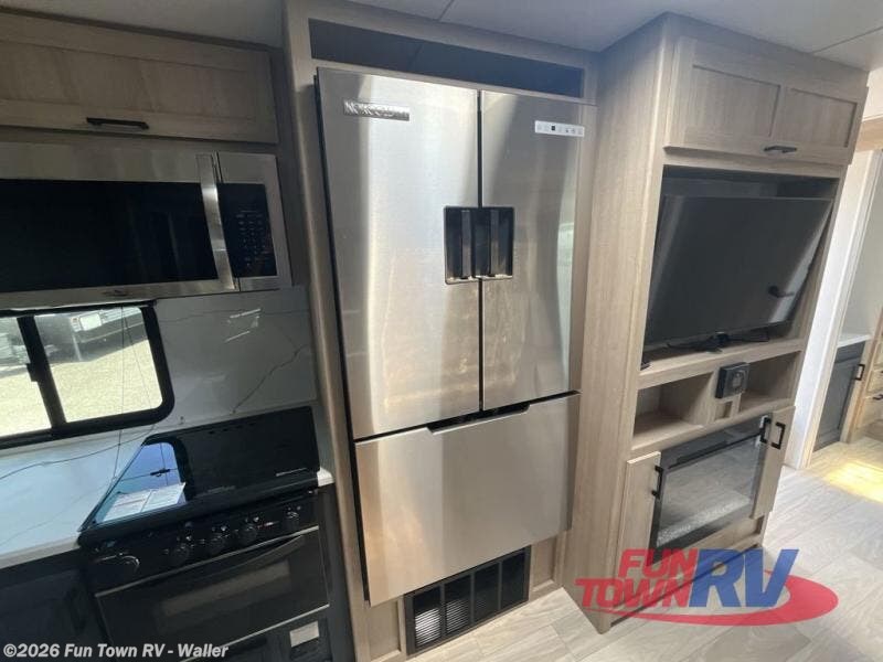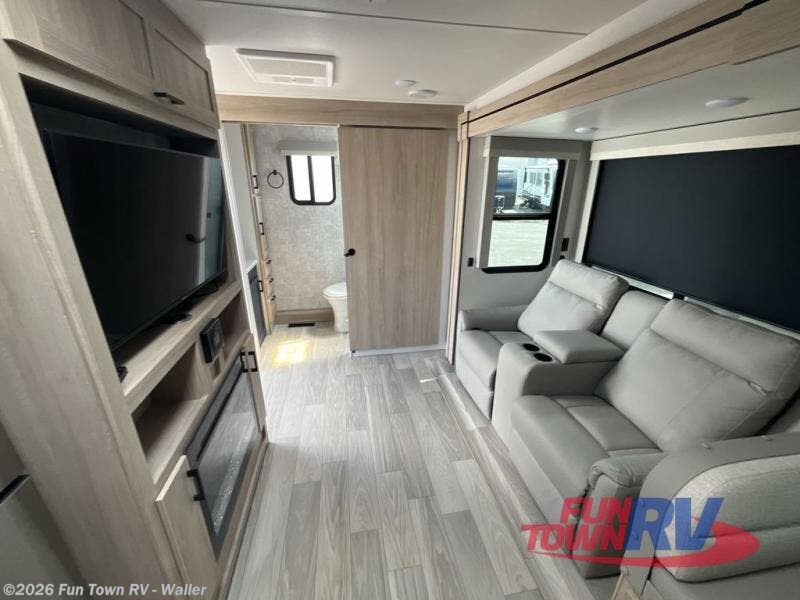 Convenience and comfort are found throughout as you return to your own accommodations after exploring the campgrounds. There are two entry doors so that you can choose to either enter the front private bedroom or the main living area. When you choose to enter through the main entrance, you will be met with a walk-in pantry to your right and a full rear bathroom to your left which is quite convenient. Within the main living area there is a large slide that has a tri-fold sofa and booth dinette across from the kitchen area. You will love sitting back on these pieces of furniture while you watch the Smart TV within the entertainment center across from you.