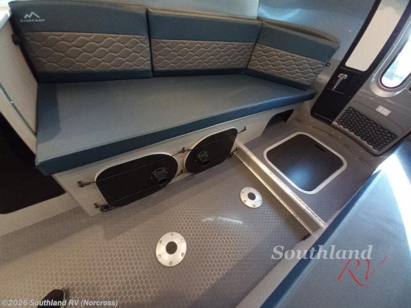 This travel trailer includes the Basecamp X Package that comes with stainless steel front stone guard protection, Goodyear off-road tires, and a 3" lift kit for added ground clearance. You can easily sleep everyone when using both the rear benches and the front U-shaped dinette. The benches provide split sleeping or a half-bed on one side and a full bed that spans the back of the trailer into an 82" x 78" area. There is storage under the cushions for the two removable tables that allow you to dine, work and relax with a place for your cellphones and such. The wet bath comes complete with a shower, sink and toilet so you can rinse off from a day outdoors, the galley kitchen gives the cook a place to make warm meals and store drinks and leftovers. This Basecamp also offers front panoramic windows, a steel entry step, a full-size spare tire, and a rear hatch allowing you to take your snowboards, skis, and paddle boards.