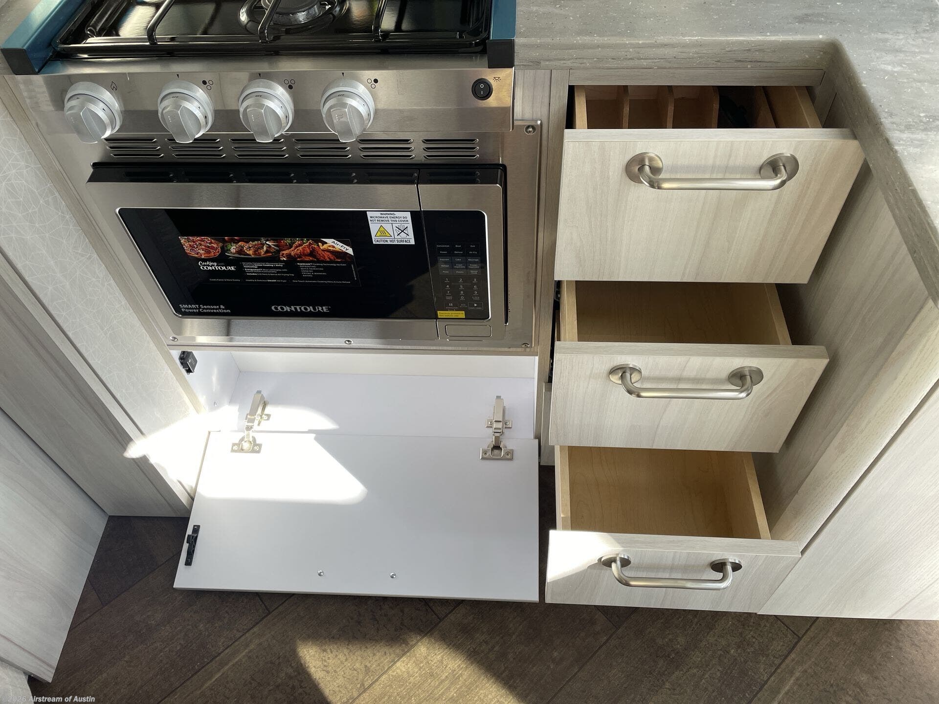 The family-friendly and popular Flying Cloud travel trailers by Airstream are built for ease of towing with a rear-view camera to make reversing and parking easier and stainless steel front stone guards to protect the lower segments from road debris. The iconic Airstream design is created outside and inside by the semi-monocoque aluminum superstructure, the temperature reducing one-piece white aluminum roof, the panoramic front windows, and the stylish aluminum wheels. The interior will have you feeling right at home with handcrafted cabinetry, plenty of storage and counter space, sleek roller blinds and blackout curtains, plus residential style faucets!