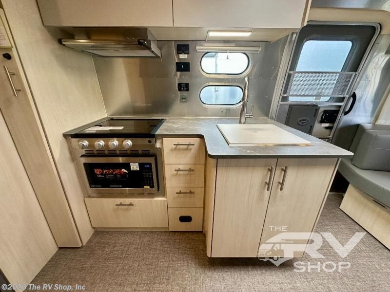 With each Flying Cloud travel trailer by Airstream, there are two axles, and each is built for ease of towing, plus there is a rear-view camera to make reversing and parking easier, and stainless steel front stone guards to protect the lower segments from road debris. The iconic Airstream design is created outside and inside by the semi-monocoque aluminum superstructure, the temperature reducing one-piece white aluminum roof, the panoramic front windows, and the stylish aluminum wheels. The interior will have you feeling right at home with handcrafted cabinetry, plenty of storage and counter space, sleek roller blinds and blackout curtains, plus residential style faucets!