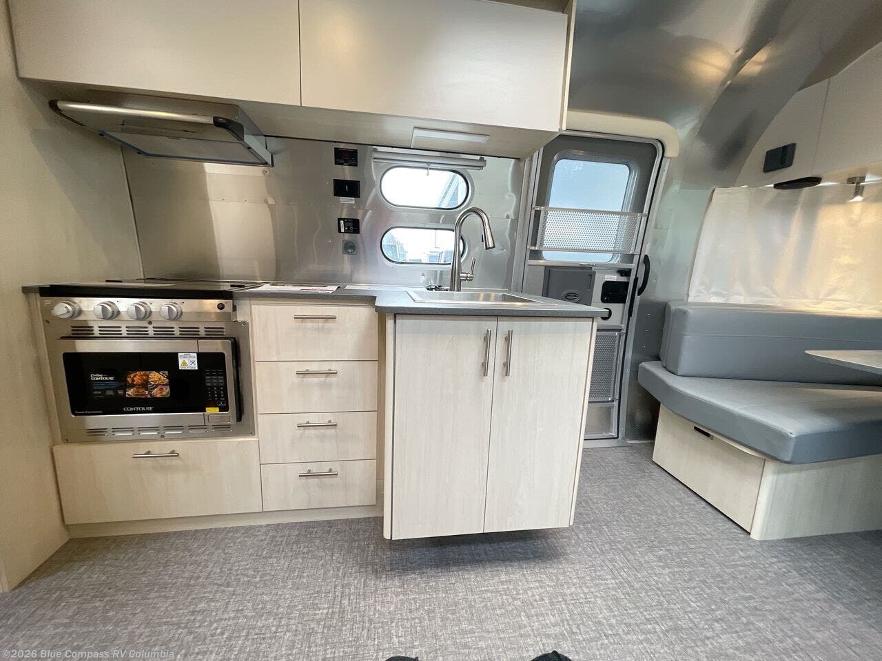 The family-friendly and popular Flying Cloud travel trailers by Airstream are built for ease of towing with a rear-view camera to make reversing and parking easier and stainless steel front stone guards to protect the lower segments from road debris. The iconic Airstream design is created outside and inside by the semi-monocoque aluminum superstructure, the temperature reducing one-piece white aluminum roof, the panoramic front windows, and the stylish aluminum wheels. The interior will have you feeling right at home with handcrafted cabinetry, plenty of storage and counter space, sleek roller blinds and blackout curtains, plus residential style faucets!