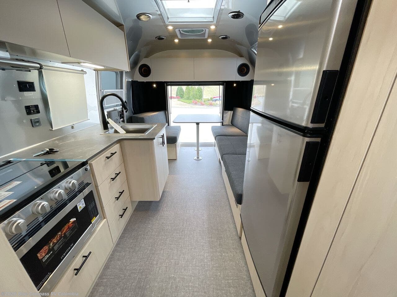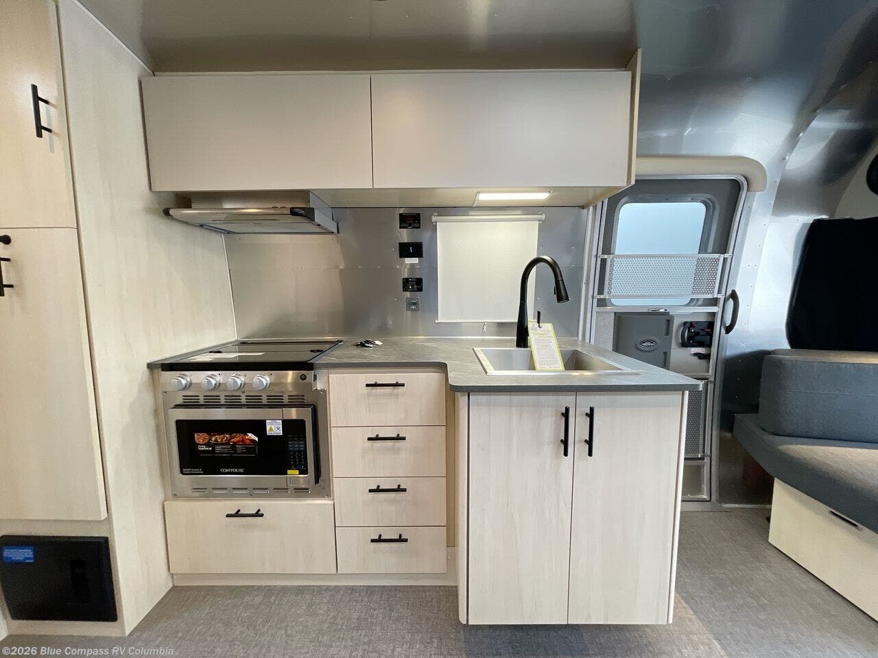 The family-friendly and popular Flying Cloud travel trailers by Airstream are built for ease of towing with a rear-view camera to make reversing and parking easier and stainless steel front stone guards to protect the lower segments from road debris. The iconic Airstream design is created outside and inside by the semi-monocoque aluminum superstructure, the temperature reducing one-piece white aluminum roof, the panoramic front windows, and the stylish aluminum wheels. The interior will have you feeling right at home with handcrafted cabinetry, plenty of storage and counter space, sleek roller blinds and blackout curtains, plus residential style faucets!