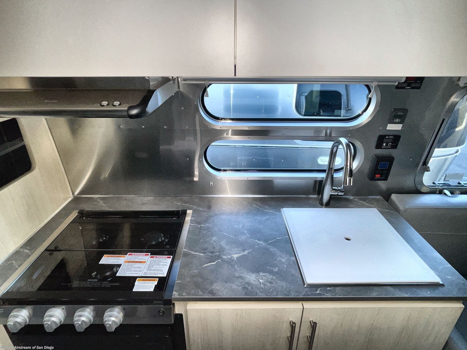 With each Flying Cloud travel trailer by Airstream, there are two axles, and each is built for ease of towing, plus there is a rear-view camera to make reversing and parking easier, and stainless steel front stone guards to protect the lower segments from road debris. The iconic Airstream design is created outside and inside by the semi-monocoque aluminum superstructure, the temperature reducing one-piece white aluminum roof, the panoramic front windows, and the stylish aluminum wheels. The interior will have you feeling right at home with handcrafted cabinetry, plenty of storage and counter space, sleek roller blinds and blackout curtains, plus residential style faucets!