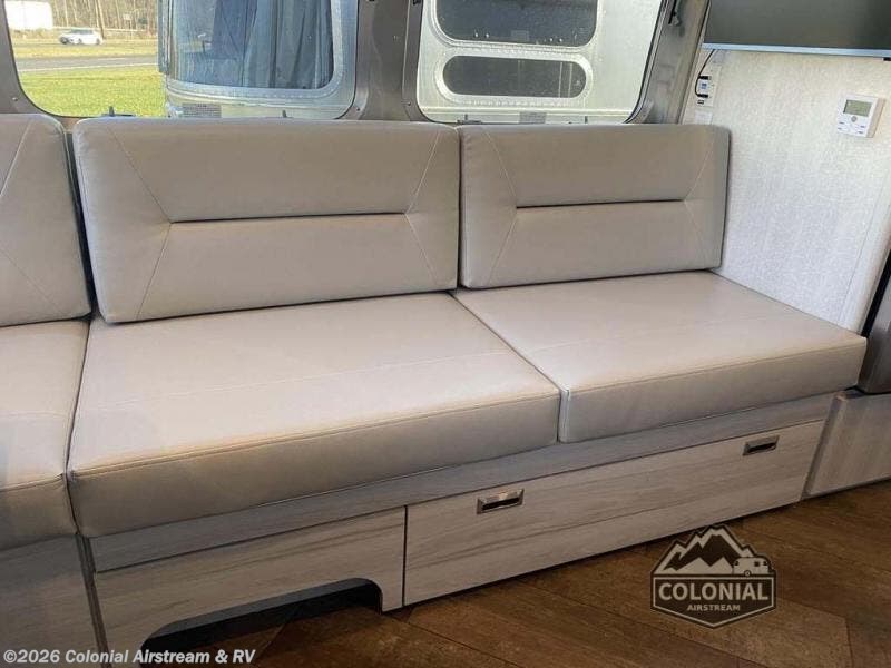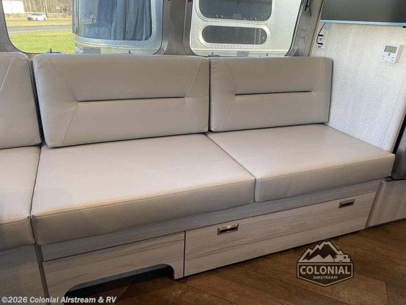 Every time you step foot into the Airstream International travel trailer, you will feel as if you are breathing in a breath of fresh air! The fresh coastal décor was inspired by the waterfront, and the stylish interior delivers a relaxing environment and comfortable luxury. The panoramic windows increase the amount of natural sunlight that streams through to the interior, but they also have blackout shades that you can close whenever you need a darkened room. The beautiful handcrafted marine-grade Lite-Ply laminated cabinetry is an attractive base for the overhead storage lockers that have sliding doors and LED lighting. The dimmable interior LED lighting will create the perfect amount of illumination for you as you spend time indoors. The exterior has excellent features as well with its enclosed aluminum insulated heated underbelly, unique front door key with heavy-duty deadbolt, optional solar package, solar front window protection, and exterior shower with hot and cold water.