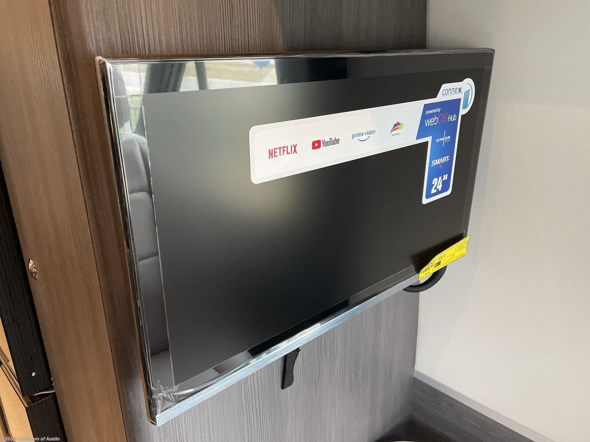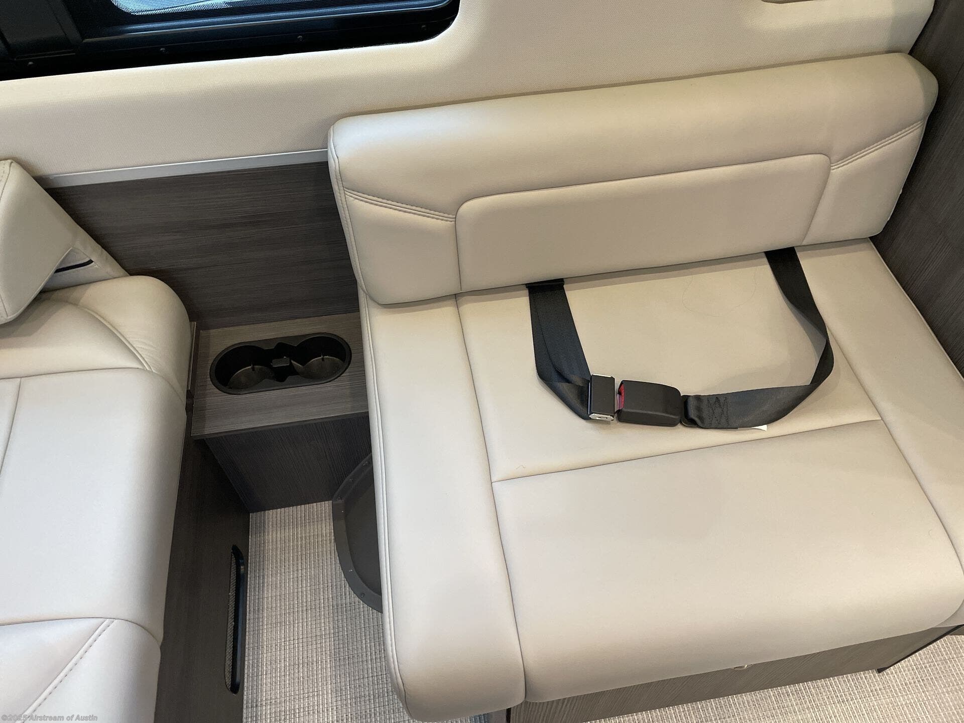 Get ready to drive and stay in comfort and luxury in this motorhome with everything you need and everything you didn't even know you wanted! The heated driver and passenger seats swivel to face the interior living space allowing you to utilize the Corian countertop with an LED TV above to place your beverages, and the driver can use this as a desk to work from here once stopped. Whip up a meal using the galley kitchen featuring a two-burner gas stove, and a large stainless steel sink and faucet, plus extra counter space for food prep. There is a 1.2 cu. ft. drawer microwave and deep drawers for storage, plus a slide-out pantry and a refrigerator with a freezer across from the sink. The power sofa in the rear can be fully flat with a push of a button so two can sleep or rest. And there is storage throughout for your hanging clothes, towels, luggage, dishes and more.