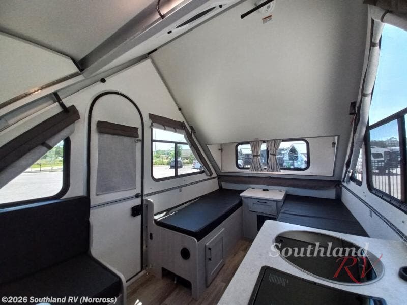 Pack your bags and be on the road in no-time with this lightweight A-frame camper that can sleep three people. You'll enjoy having two 28" x 75" permanent twin beds with storage underneath for your shoes or bags, and if you have a guest sleep over, they can sleep on the dinette that converts to a 46" x 76" bed. Whip up a hearty lunch on the two burner in/out stove, or use the convenient microwave oven. There is also a 3.0 cu. ft. 2-way refrigerator for perishables and additional storage space for dry goods.