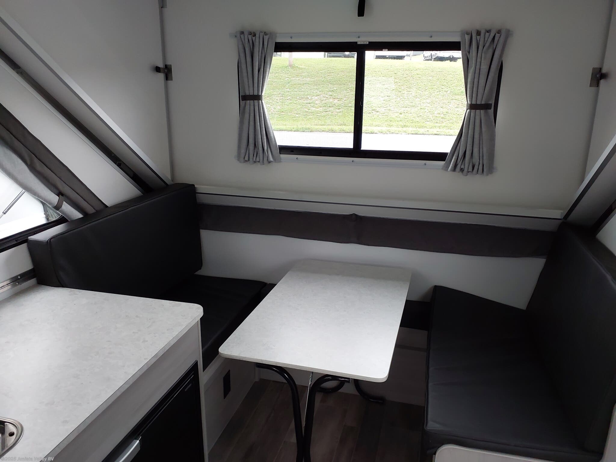 The **rear sofa floorplan** offers cozy comfort for up to 3 sleepers, featuring a thoughtful layout that maximizes space and functionality. With a height that comfortably allows for standing and movement inside, the Aliner Expedition provides an inviting interior experience. The popup design ensures easy storage and mobility, allowing you to park in tighter spots without sacrificing comfort.
